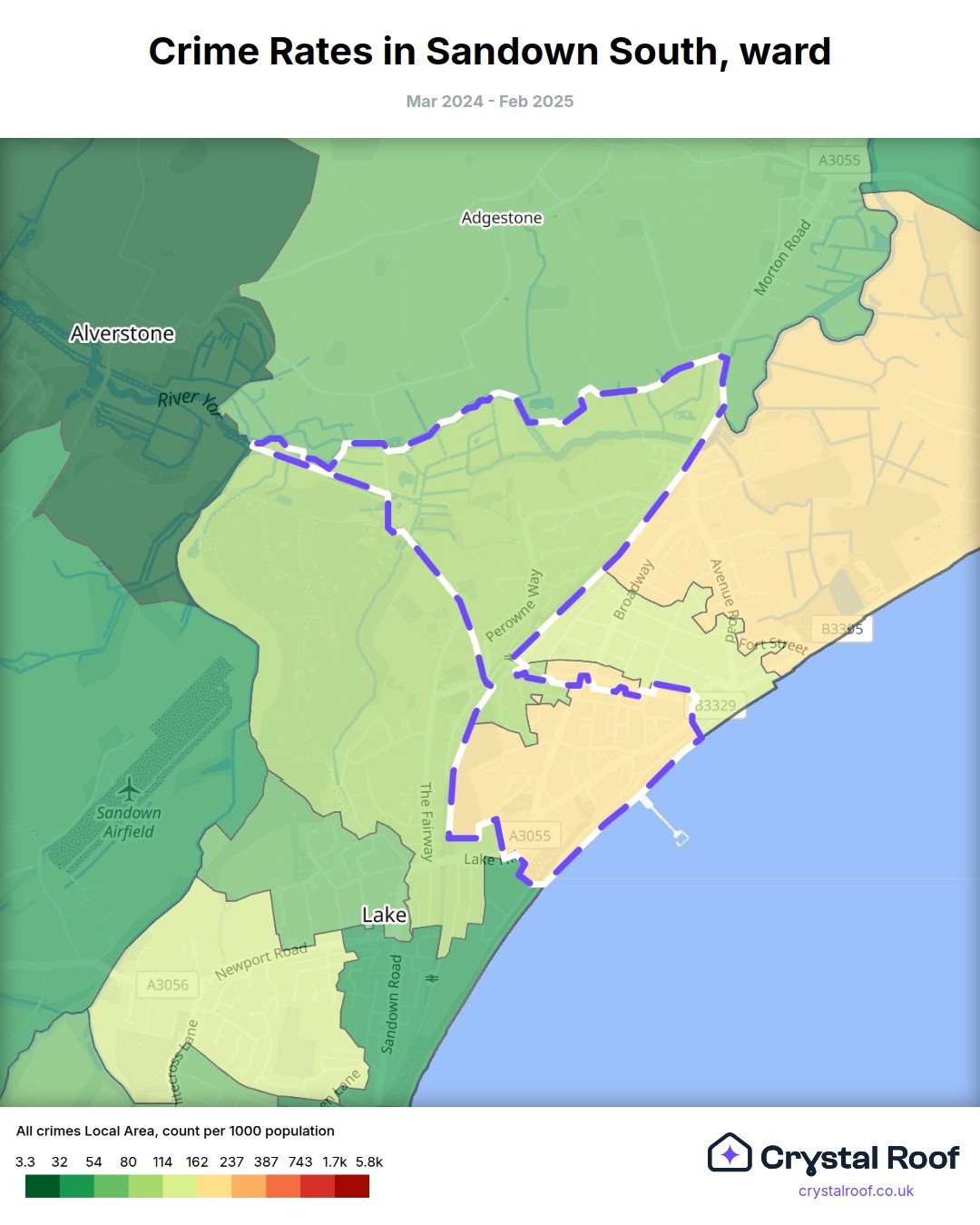 Sandown South, (ward) includes areas with the following crime ratings (see map):
