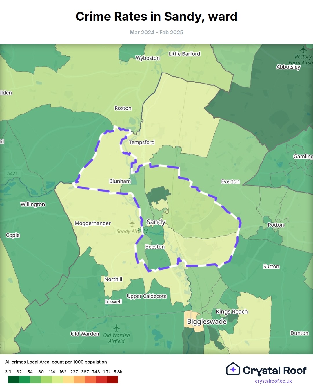 The figures in grey indicate the relative ratings of Sandy (ward) for a specific crime type compared to other wards in England and Wales.