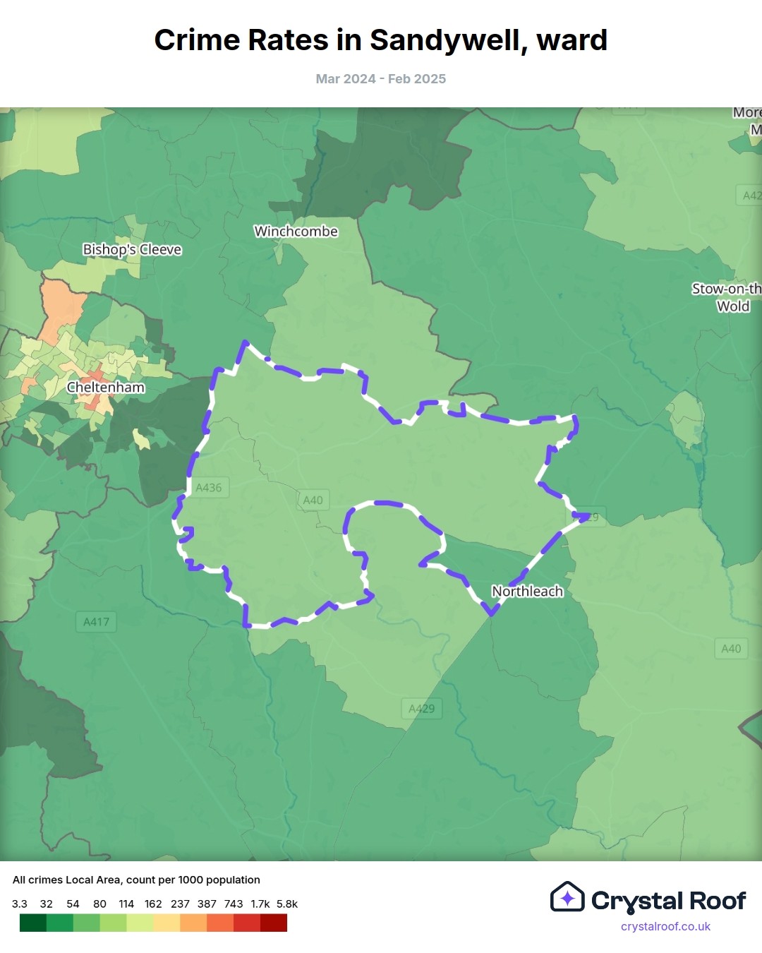 Sandywell (ward) is located within Cotswold (borough). Annual total crime rate in Cotswold (borough) is 58.6 crimes per thousand resident population, which can be rated as 2 out of 10 or low crime level compared to other local authority districts in England and Wales.