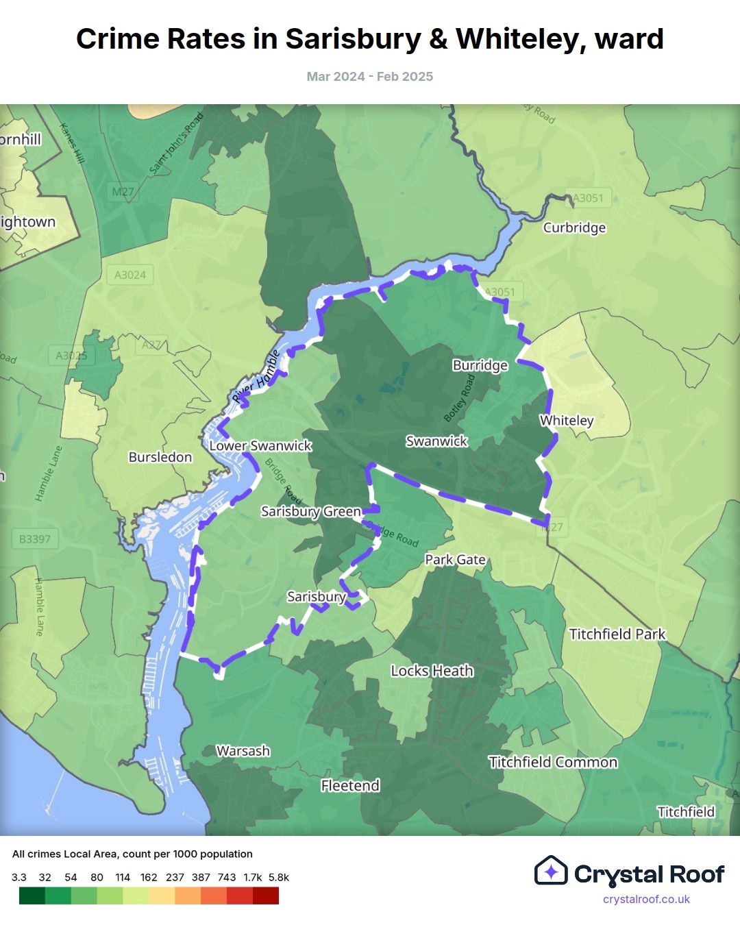 Sarisbury & Whiteley, (ward) includes areas with the following crime ratings (see map):