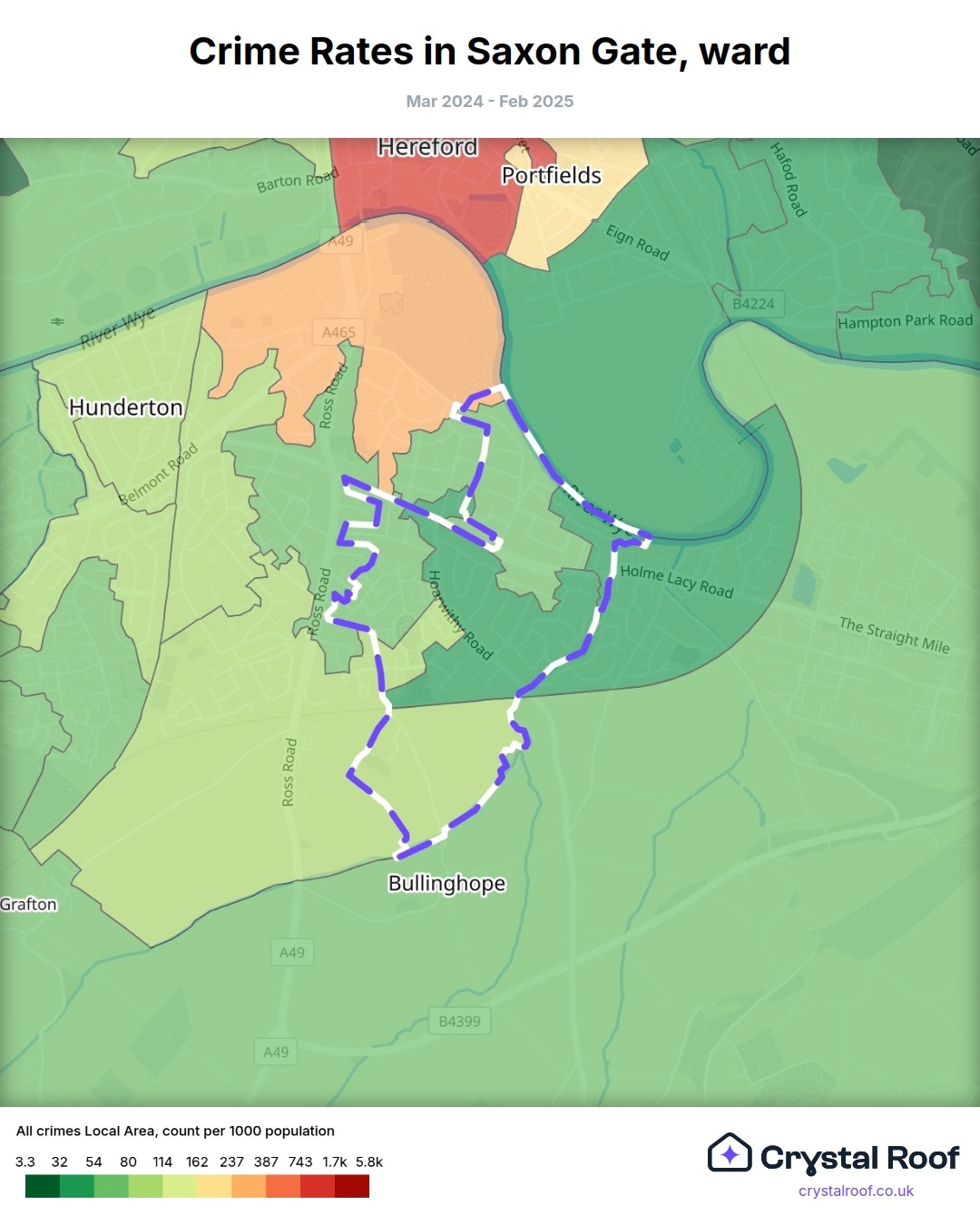 Saxon Gate (ward) is located within Herefordshire, County of (borough). Annual total crime rate in Herefordshire, County of (borough) is 63.5 crimes per thousand resident population, which can be rated as 2 out of 10 or low crime level compared to other local authority districts in England and Wales.