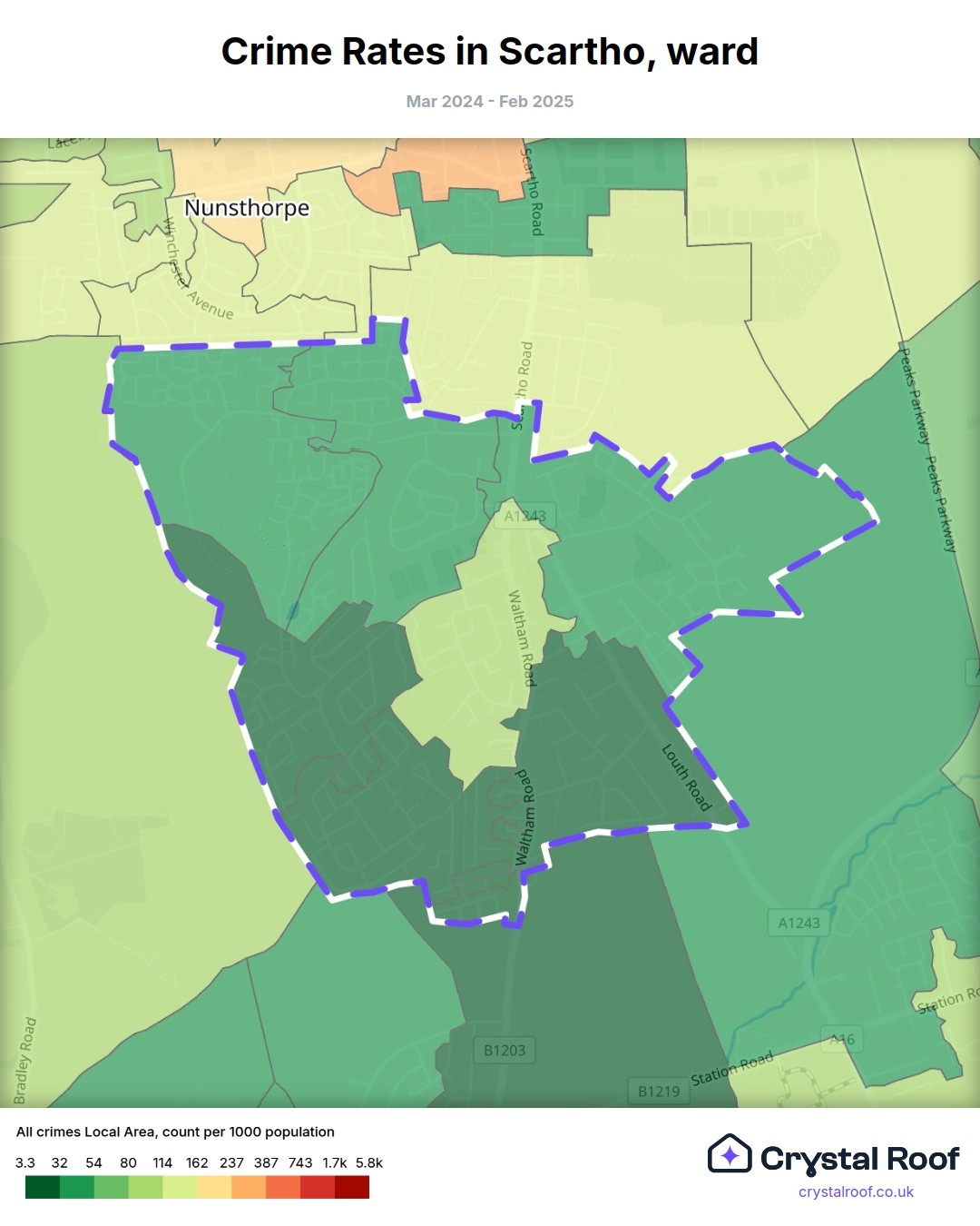 Scartho, (ward) includes areas with the following crime ratings (see map):