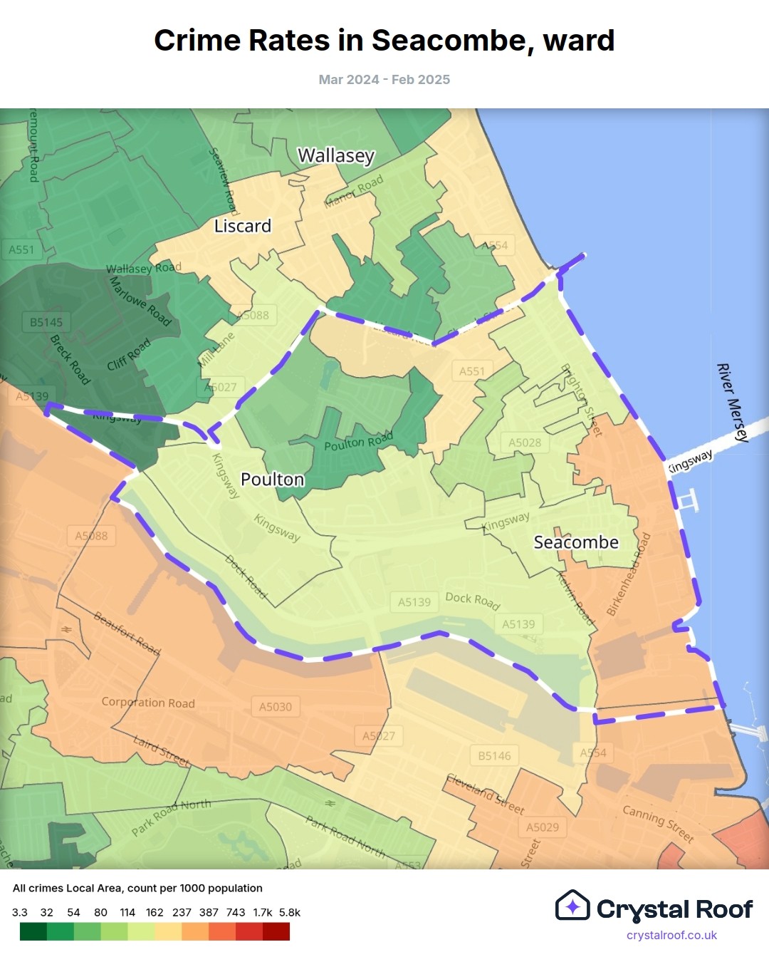 Seacombe, (ward) includes areas with the following crime ratings (see map):