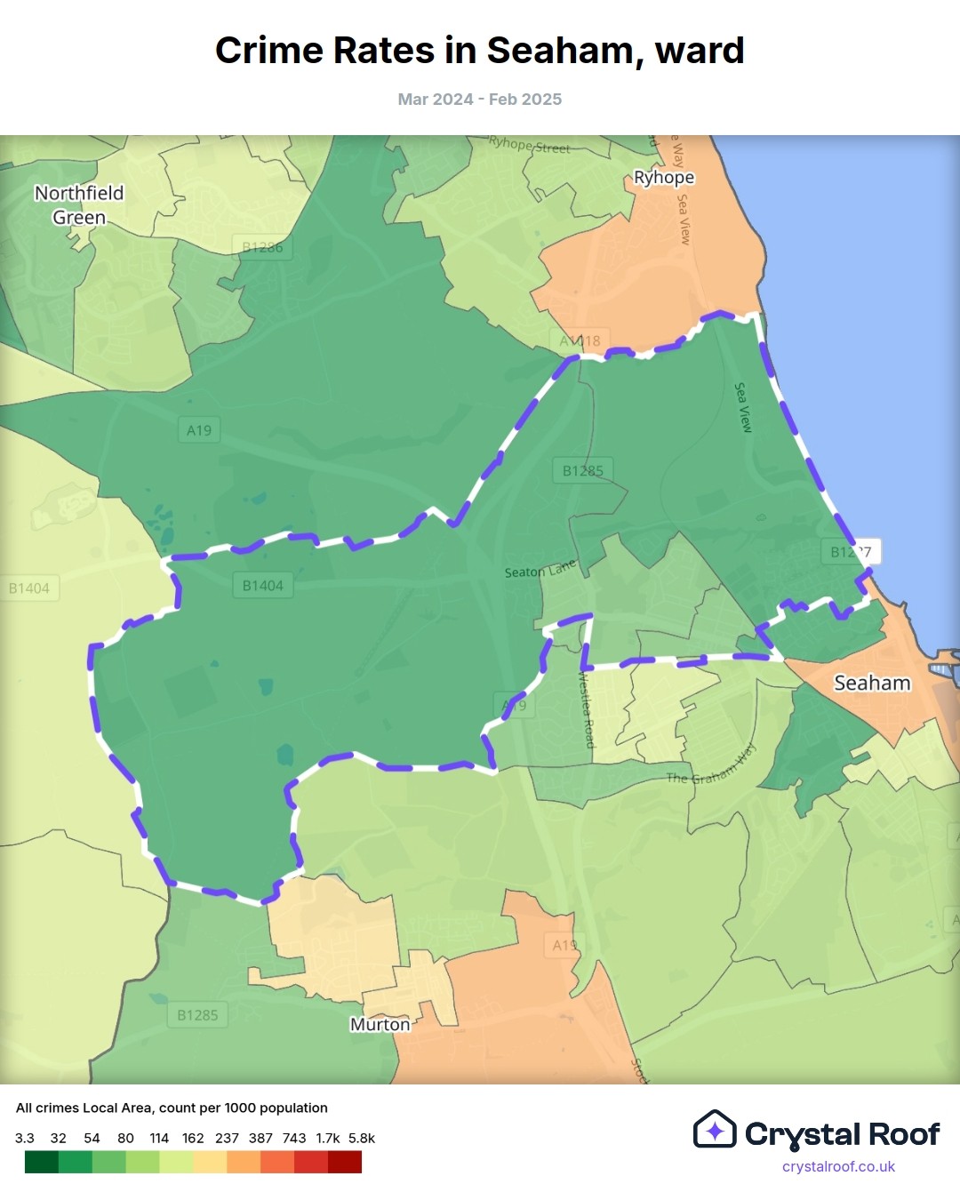 Seaham, (ward) includes areas with the following crime ratings (see map):