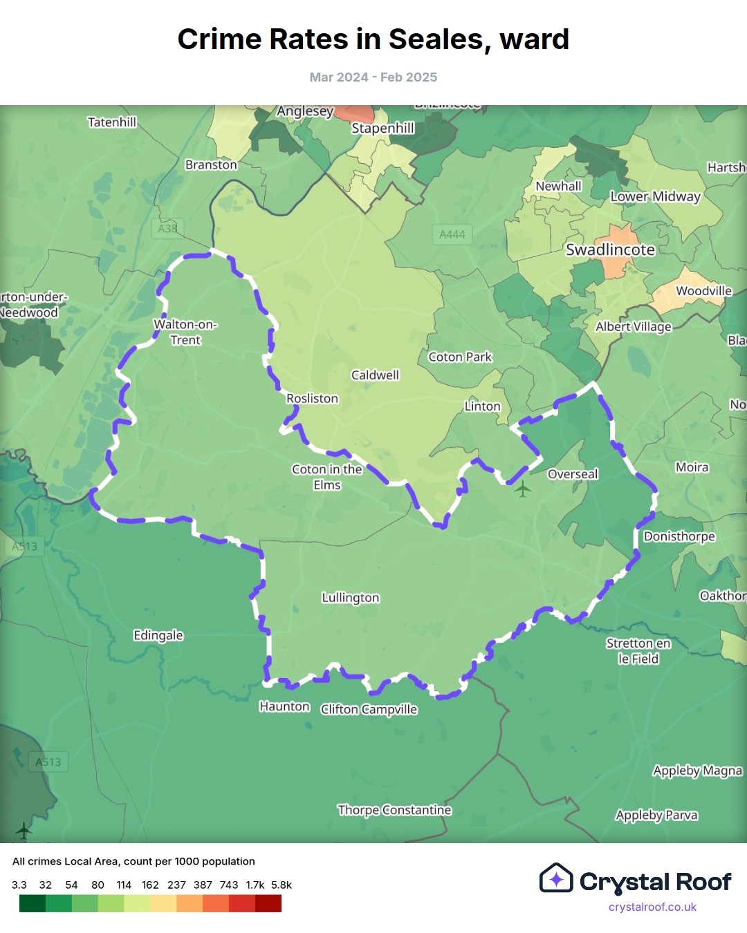 Seales (ward) is located within South Derbyshire (borough). Annual total crime rate in South Derbyshire (borough) is 70.9 crimes per thousand resident population, which can be rated as 2 out of 10 or low crime level compared to other local authority districts in England and Wales.