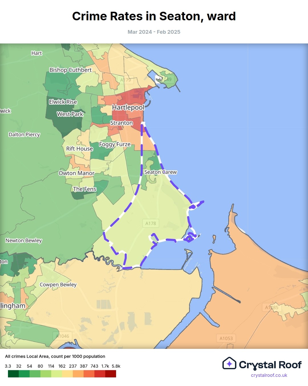 Seaton (ward) is located within Hartlepool (borough). Annual total crime rate in Hartlepool (borough) is 171 crimes per thousand resident population, which can be rated as 8 out of 10 or high crime level compared to other local authority districts in England and Wales.