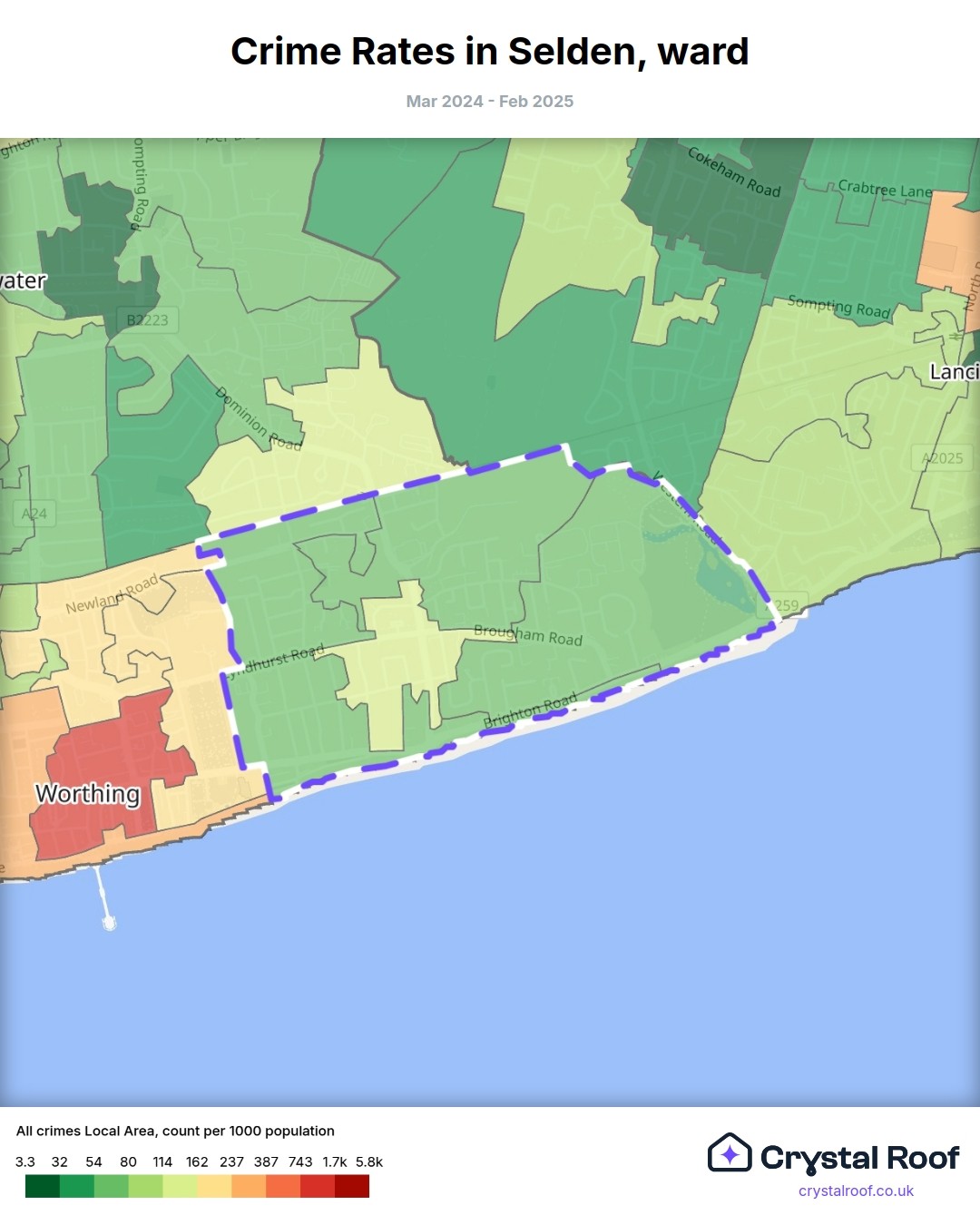 Selden (ward) is located within Worthing (borough). Annual total crime rate in Worthing (borough) is 88.9 crimes per thousand resident population, which can be rated as 4 out of 10 or low crime level compared to other local authority districts in England and Wales.