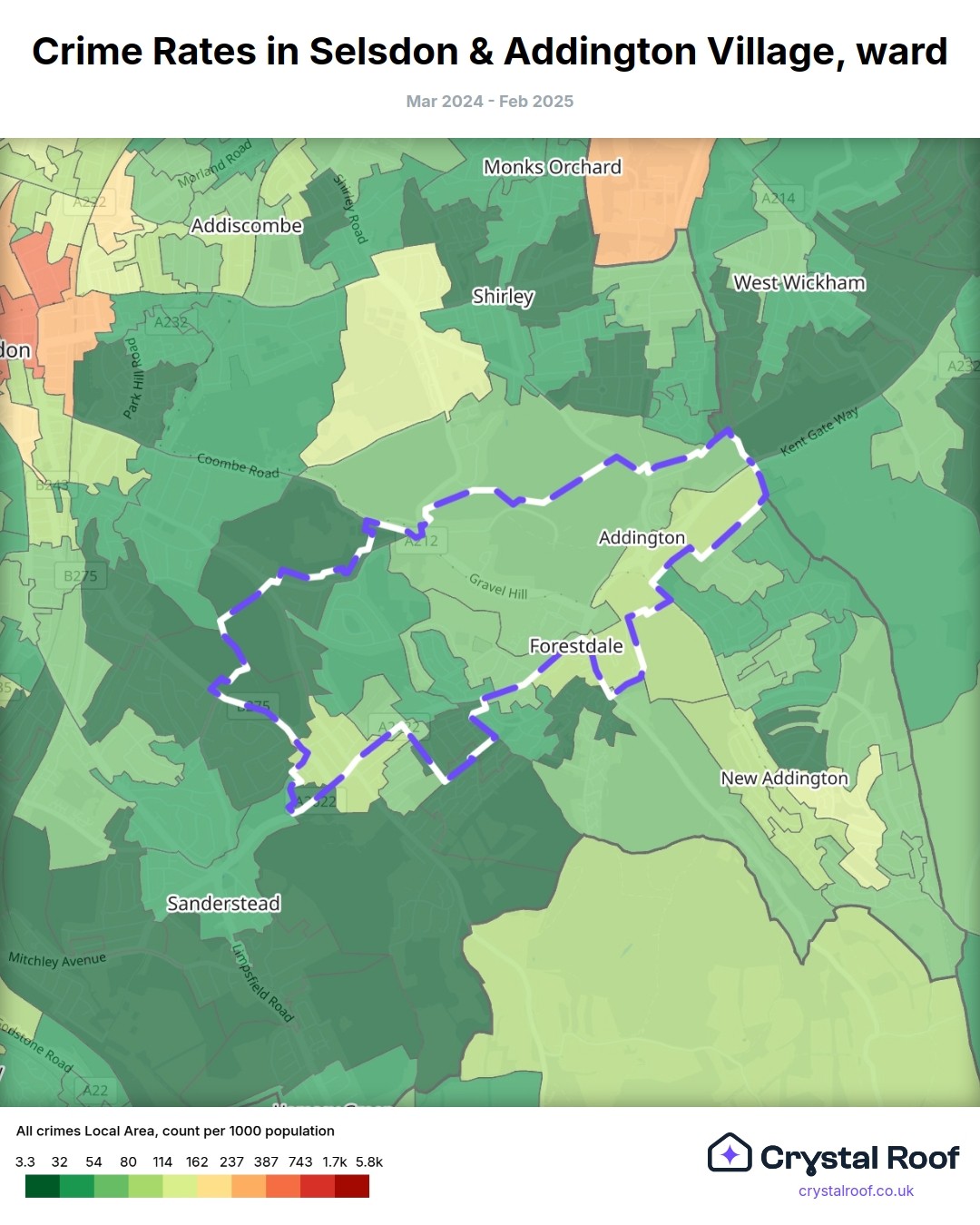 Selsdon & Addington Village, (ward) includes areas with the following crime ratings (see map):
