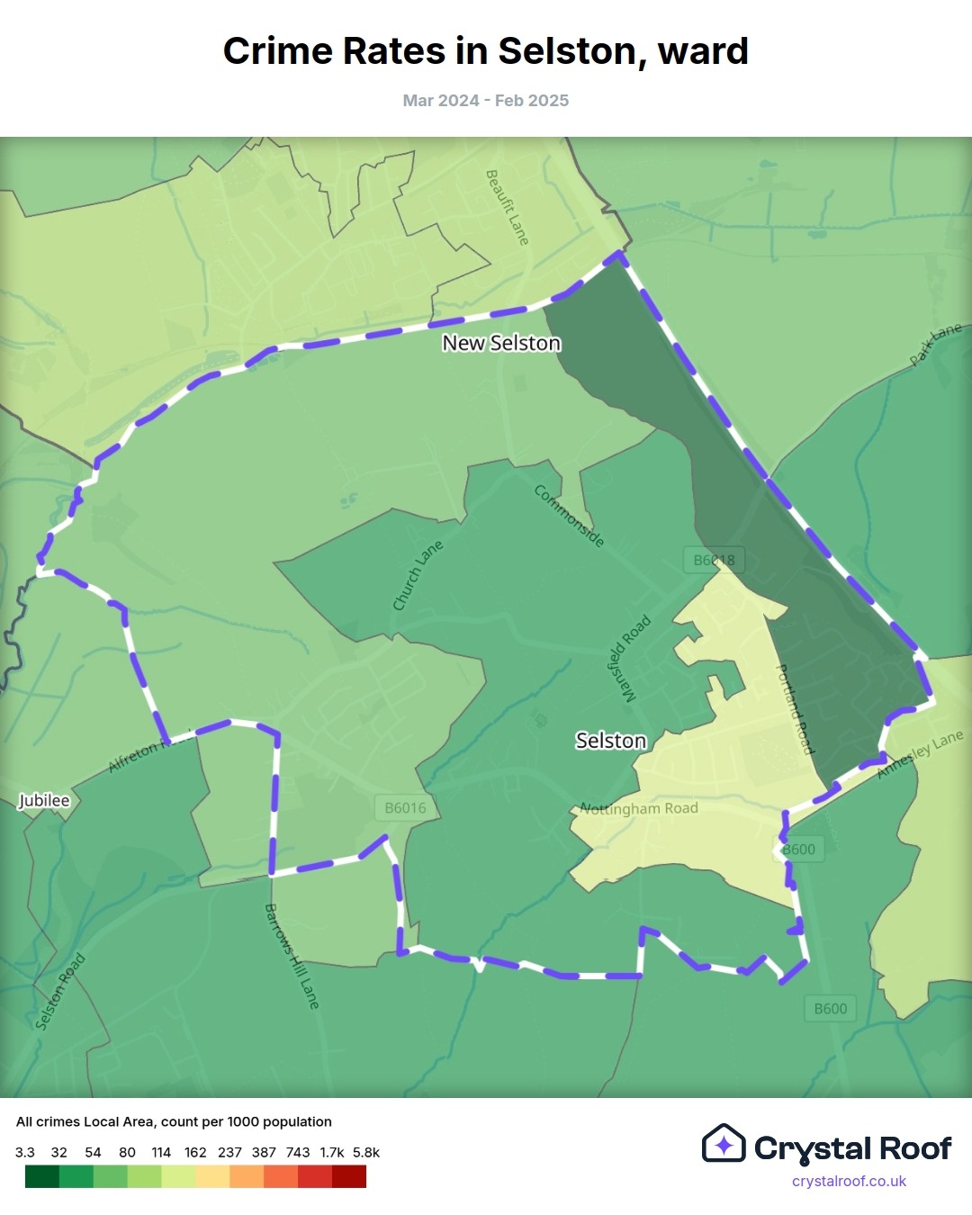 Selston, (ward) includes areas with the following crime ratings (see map):