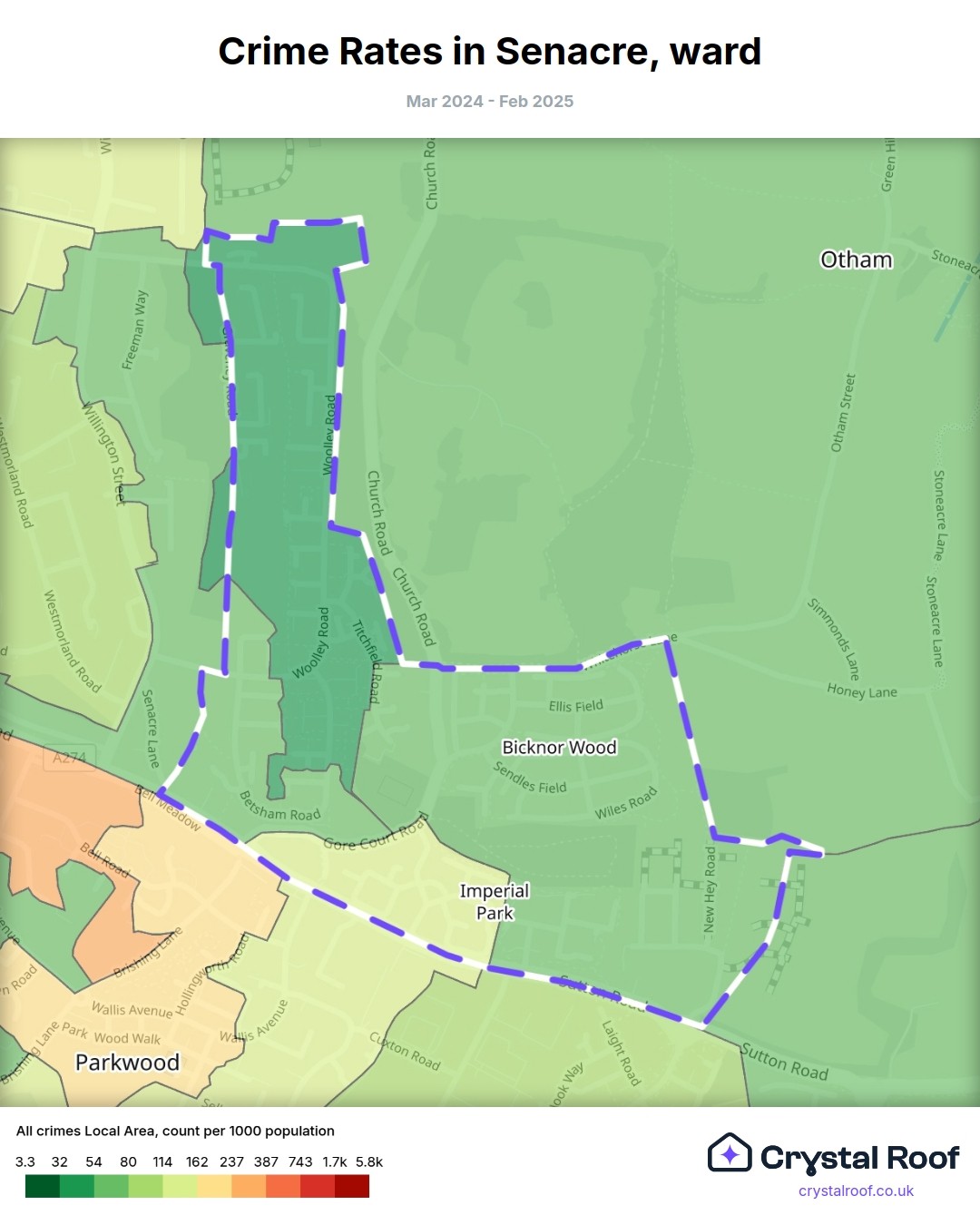 The figures in grey indicate the relative ratings of Senacre (ward) for a specific crime type compared to other wards in England and Wales.