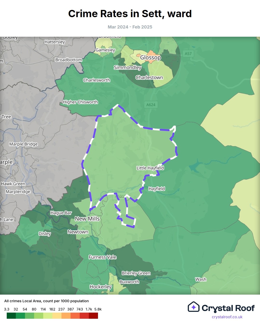 Sett (ward) is located within High Peak (borough). Annual total crime rate in High Peak (borough) is 73.9 crimes per thousand resident population, which can be rated as 3 out of 10 or low crime level compared to other local authority districts in England and Wales.