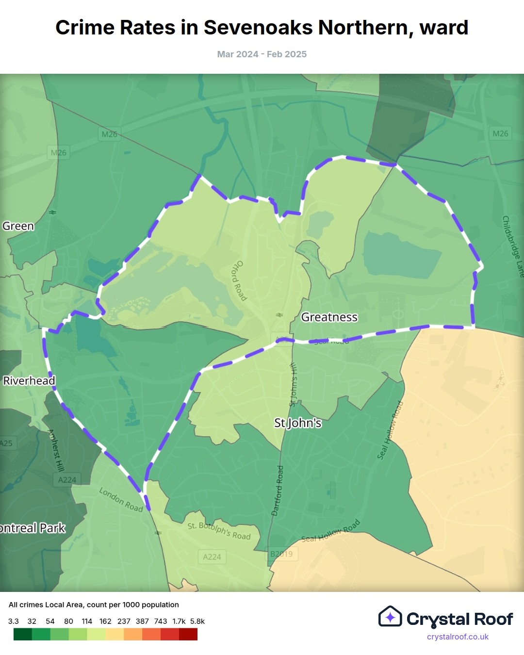 Sevenoaks Northern (ward) is located within Sevenoaks (borough). Annual total crime rate in Sevenoaks (borough) is 65 crimes per thousand resident population, which can be rated as 2 out of 10 or low crime level compared to other local authority districts in England and Wales.