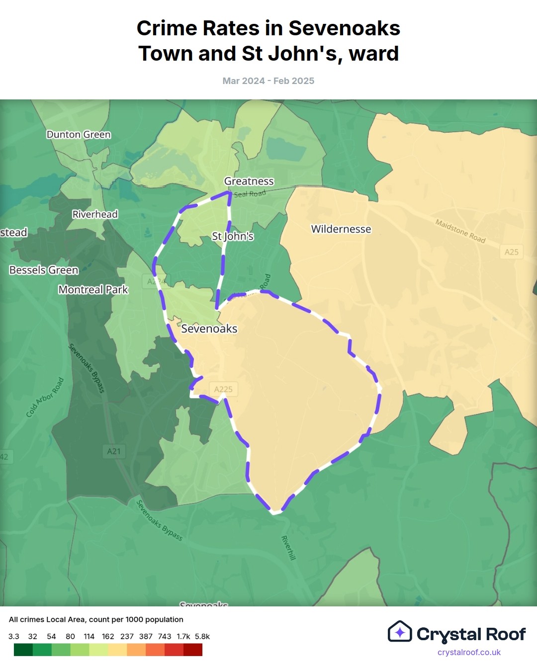 Sevenoaks Town and St John's, (ward) includes areas with the following crime ratings (see map):