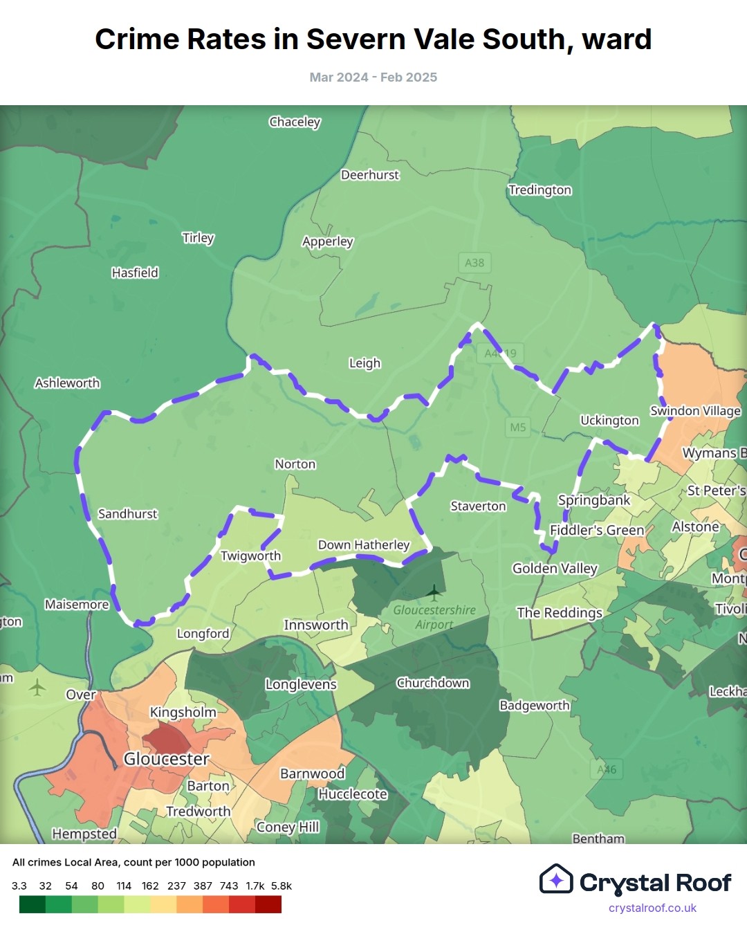 The figures in grey indicate the relative ratings of Severn Vale South (ward) for a specific crime type compared to other wards in England and Wales.