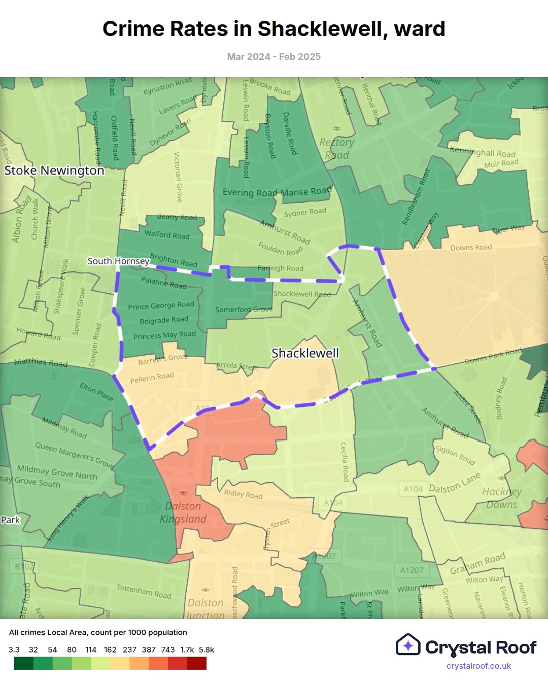 Shacklewell, (ward) includes areas with the following crime ratings (see map):