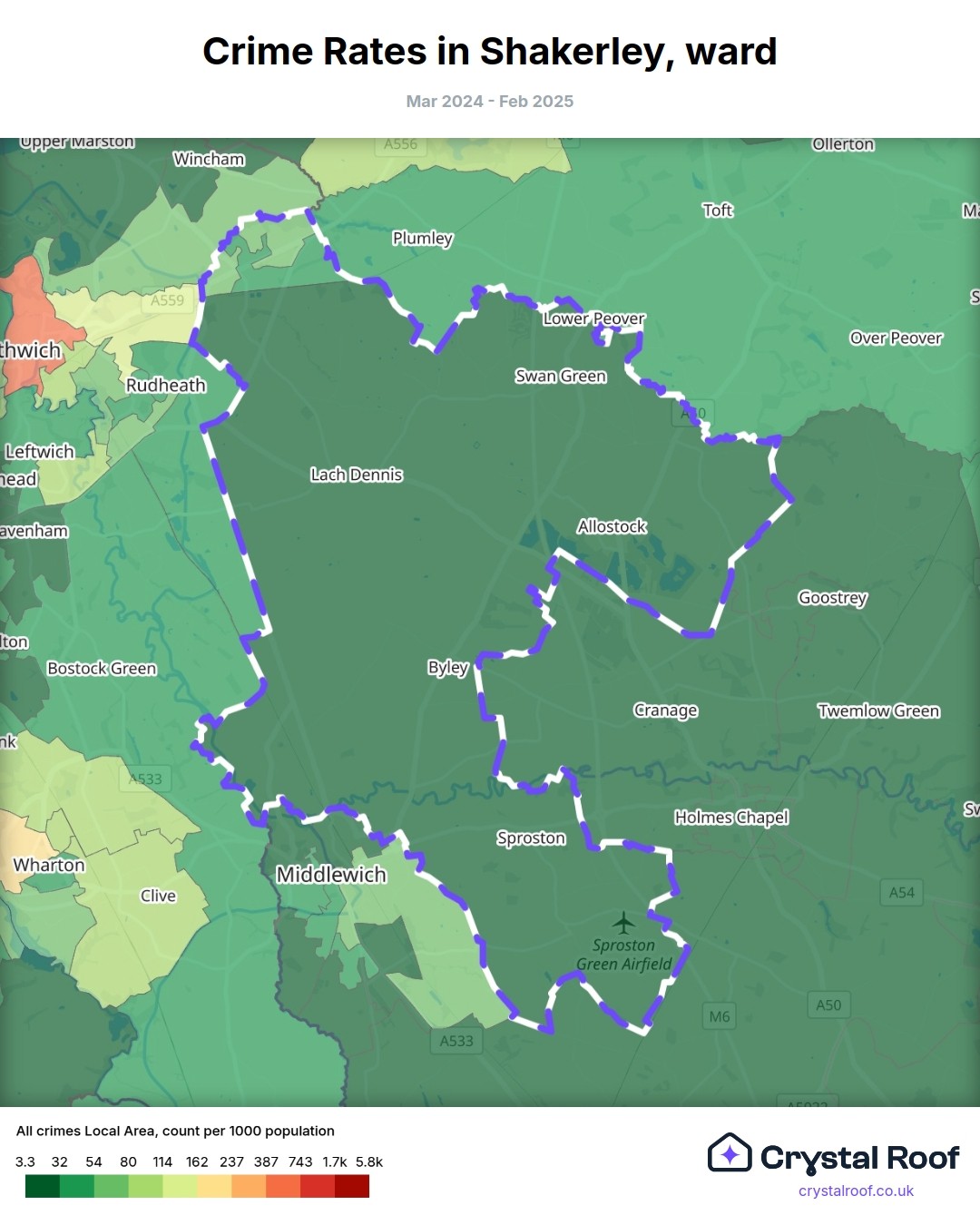 Shakerley (ward) is located within Cheshire West and Chester (borough). Annual total crime rate in Cheshire West and Chester (borough) is 69.3 crimes per thousand resident population, which can be rated as 2 out of 10 or low crime level compared to other local authority districts in England and Wales.