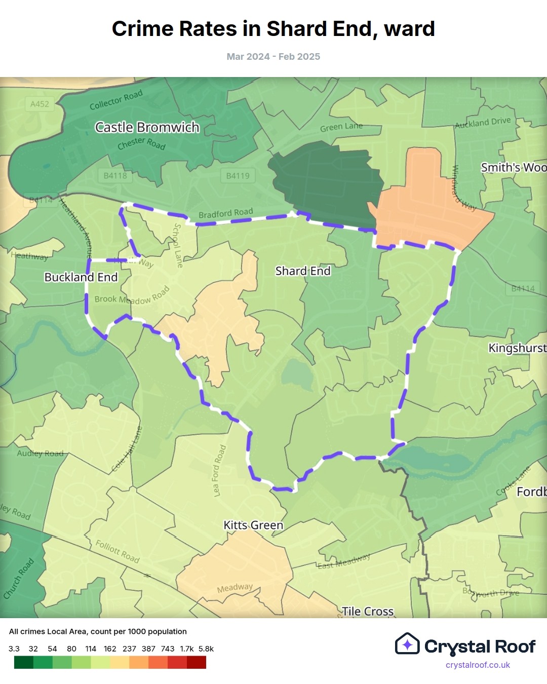 The figures in grey indicate the relative ratings of Shard End (ward) for a specific crime type compared to other wards in England and Wales.