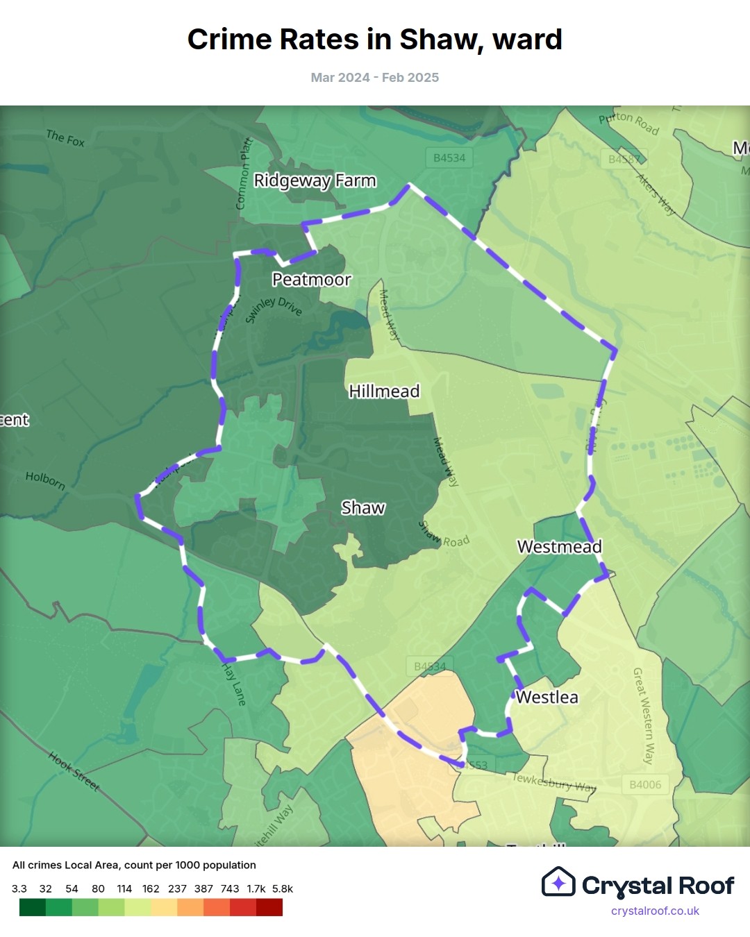 Shaw (ward) is located within Swindon (borough). Annual total crime rate in Swindon (borough) is 86.5 crimes per thousand resident population, which can be rated as 4 out of 10 or low crime level compared to other local authority districts in England and Wales.