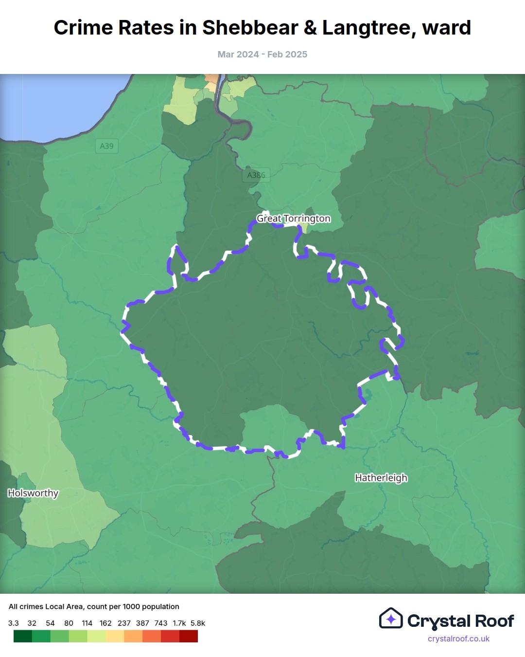 Shebbear & Langtree, (ward) includes areas with the following crime ratings (see map):