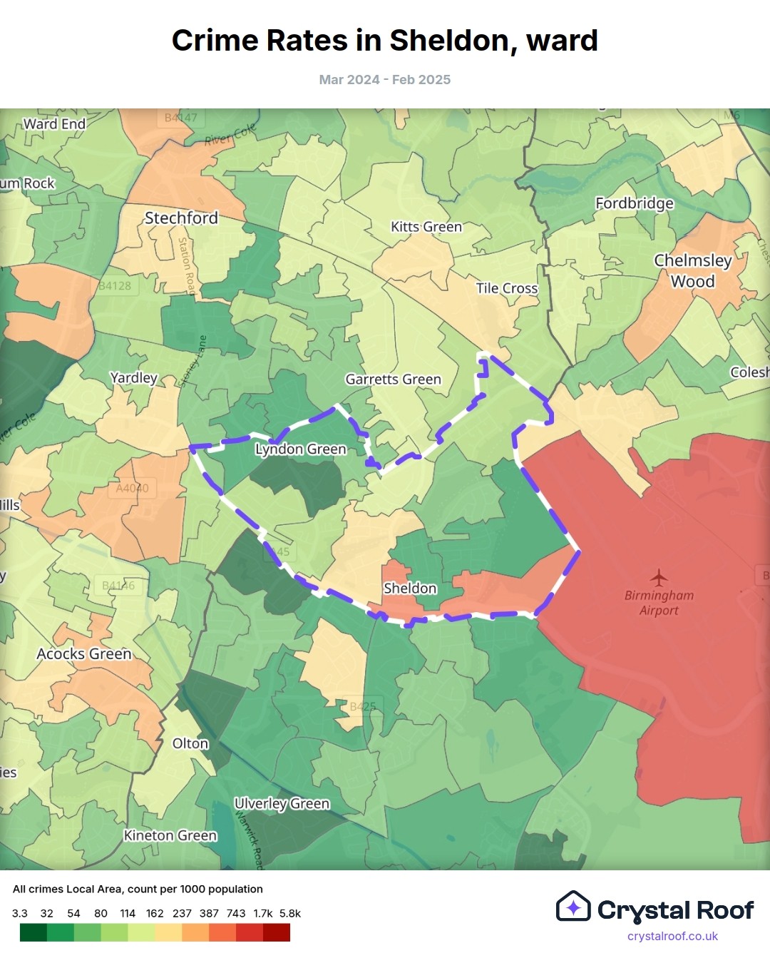 Sheldon (ward) is located within Birmingham (borough). Annual total crime rate in Birmingham (borough) is 130 crimes per thousand resident population, which can be rated as 6 out of 10 or medium crime level compared to other local authority districts in England and Wales.