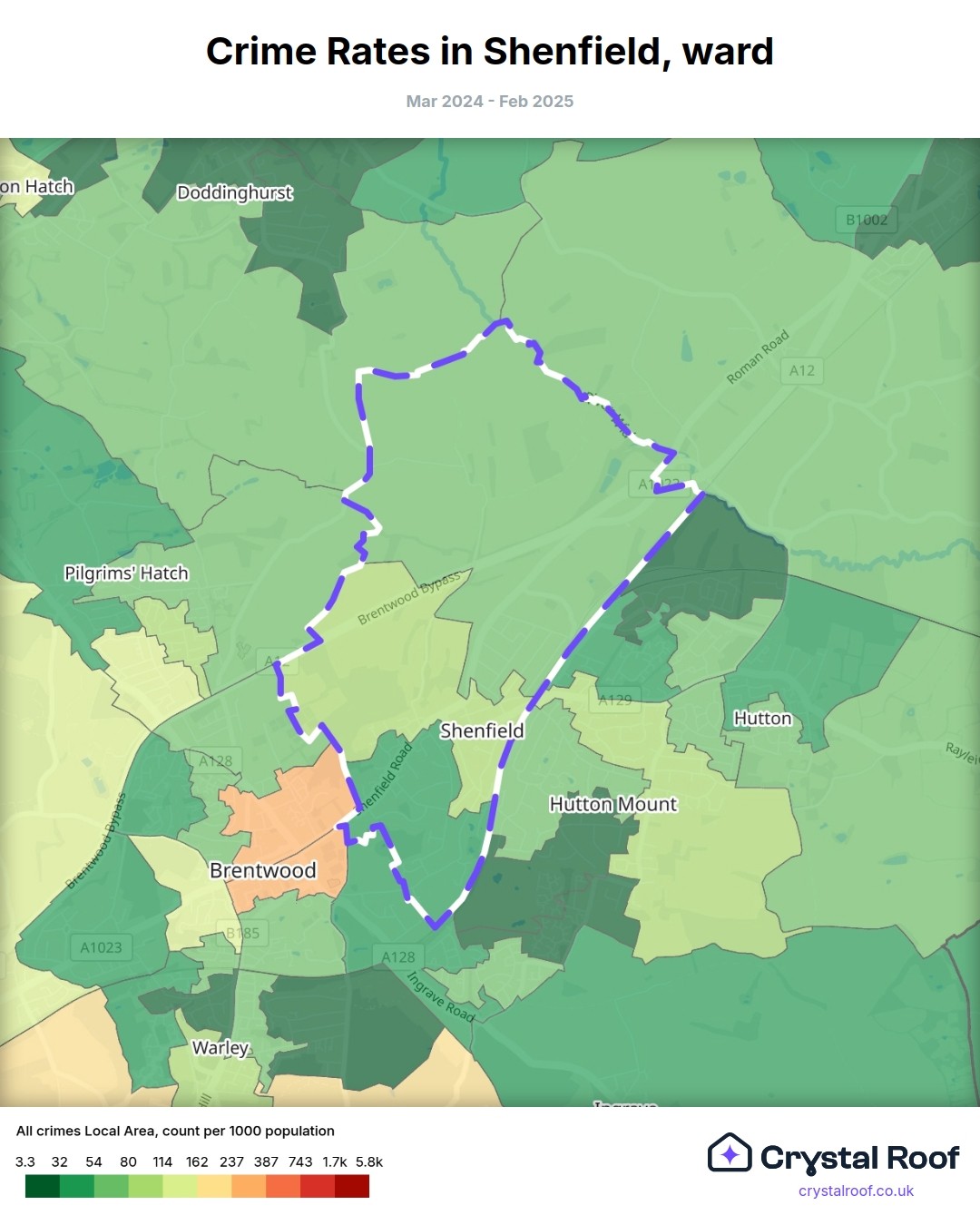 Shenfield, (ward) includes areas with the following crime ratings (see map):