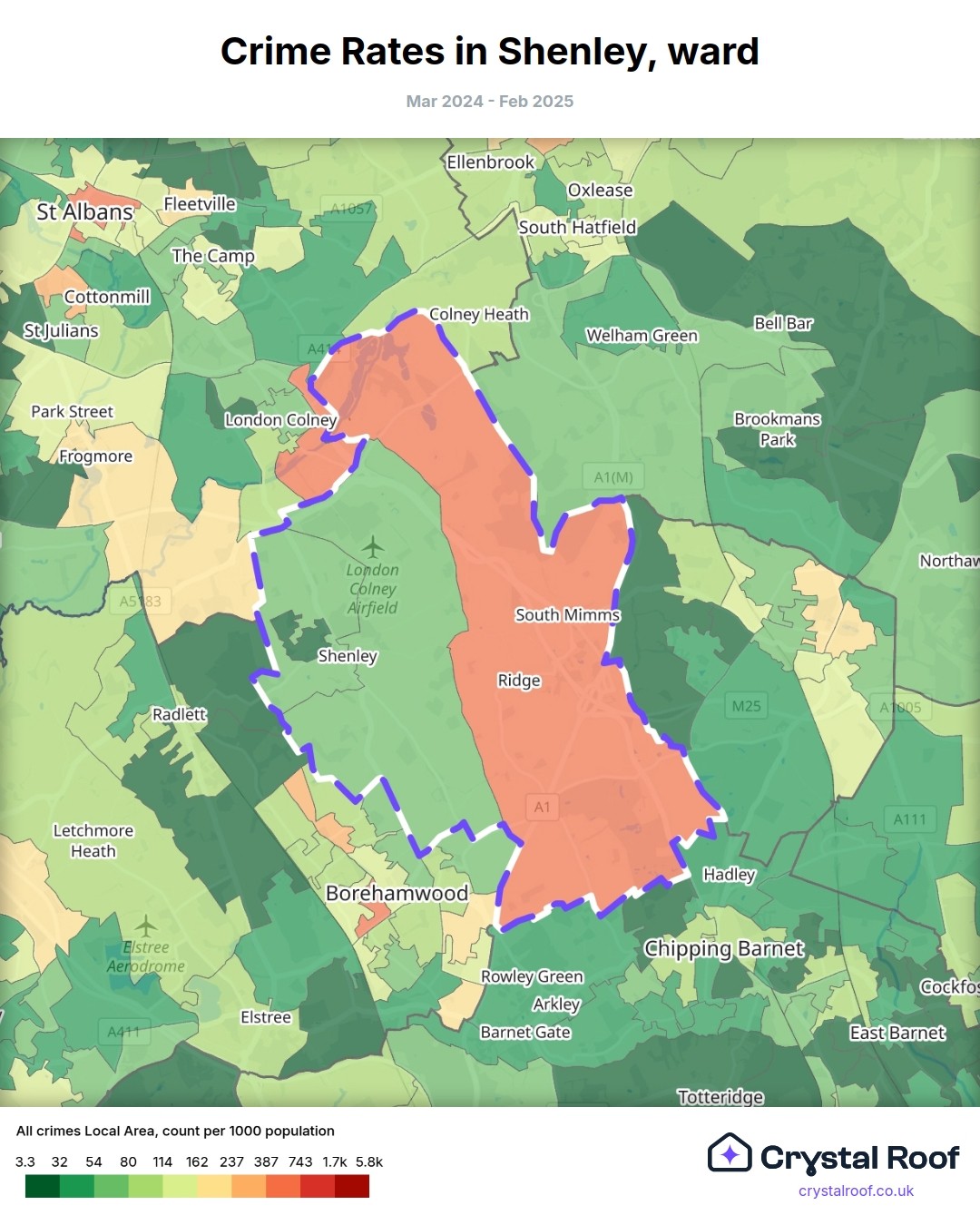 Shenley, (ward) includes areas with the following crime ratings (see map):
