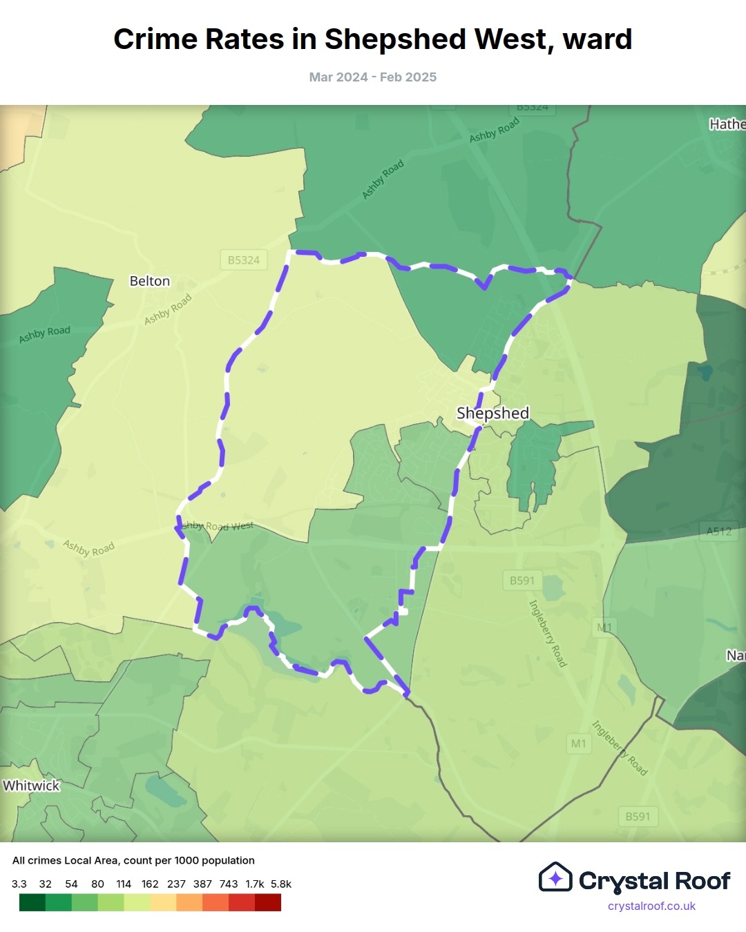 Shepshed West, (ward) includes areas with the following crime ratings (see map):