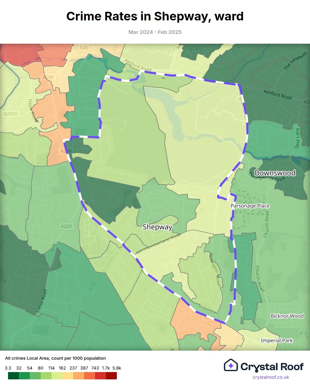 Shepway (ward) is located within Maidstone (borough). Annual total crime rate in Maidstone (borough) is 95.1 crimes per thousand resident population, which can be rated as 4 out of 10 or low crime level compared to other local authority districts in England and Wales.