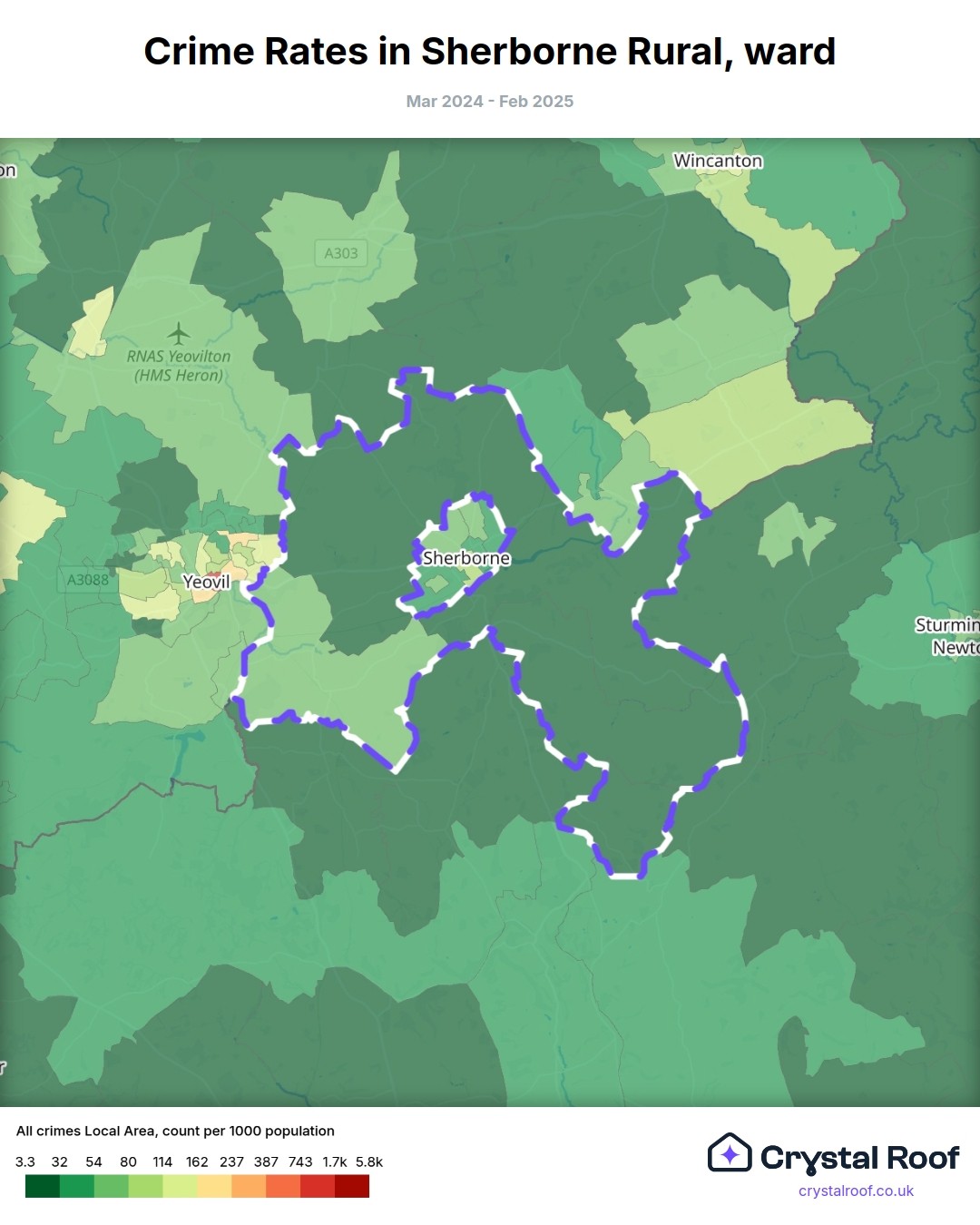 Sherborne Rural, (ward) includes areas with the following crime ratings (see map):