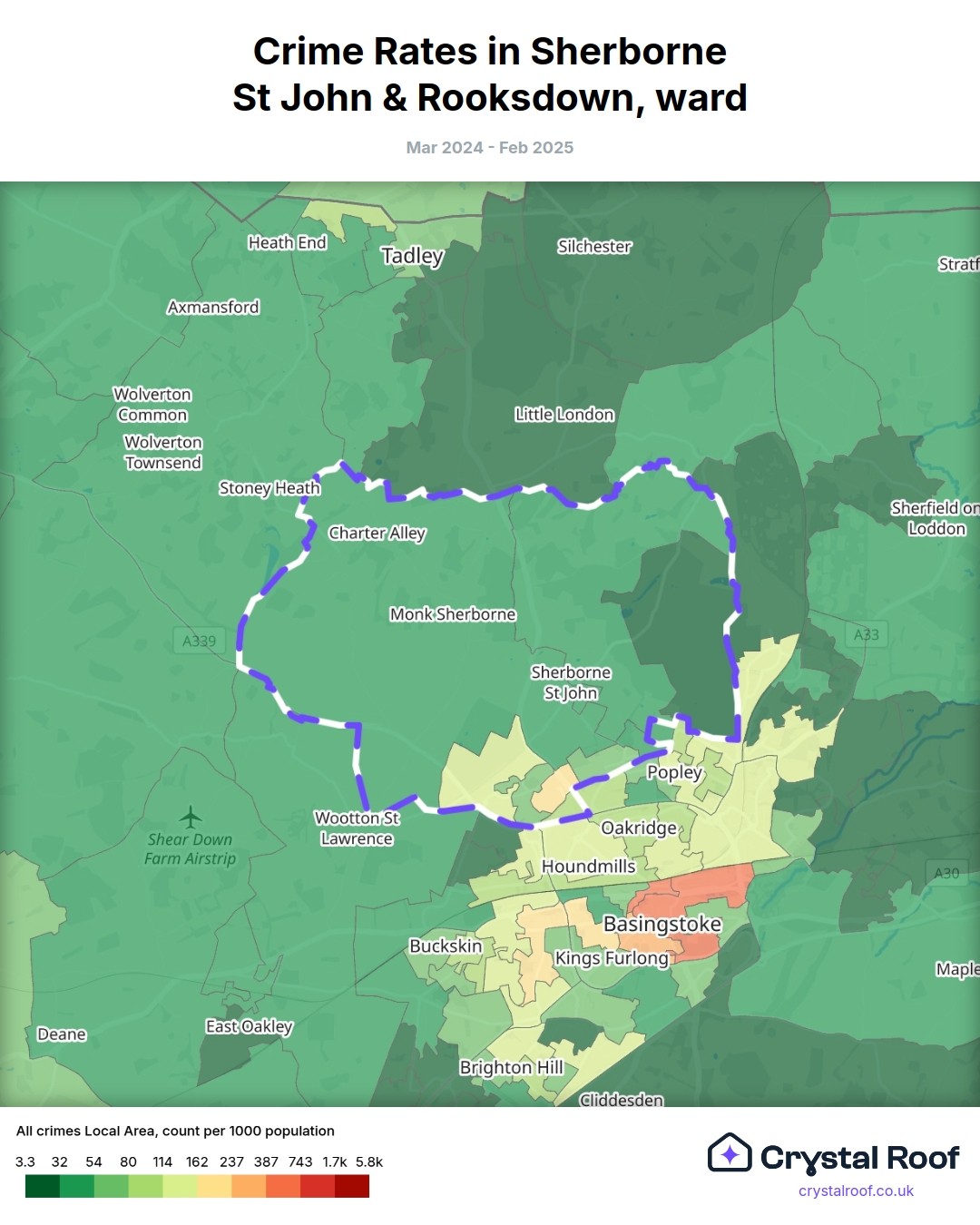 Sherborne St John & Rooksdown, (ward) includes areas with the following crime ratings (see map):