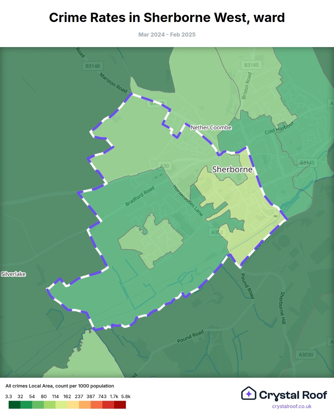 Sherborne West, (ward) includes areas with the following crime ratings (see map):