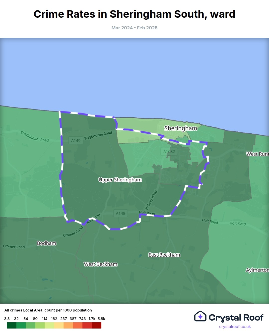 Sheringham South, (ward) includes areas with the following crime ratings (see map):