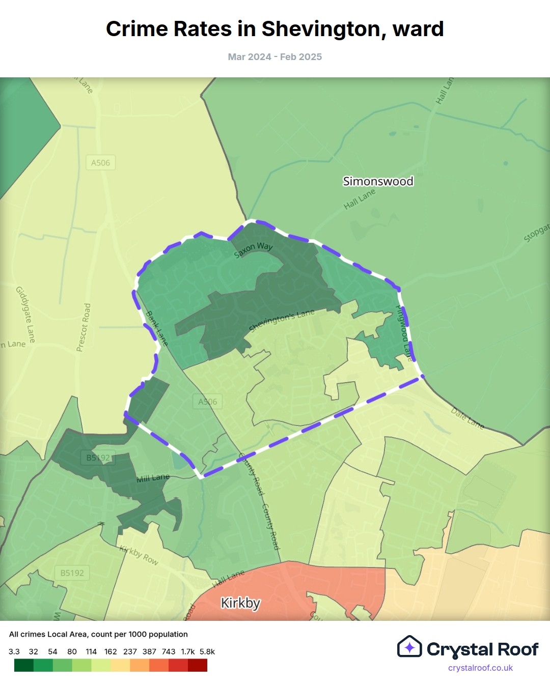 Shevington (ward) is located within Knowsley (borough). Annual total crime rate in Knowsley (borough) is 98.3 crimes per thousand resident population, which can be rated as 4 out of 10 or low crime level compared to other local authority districts in England and Wales.