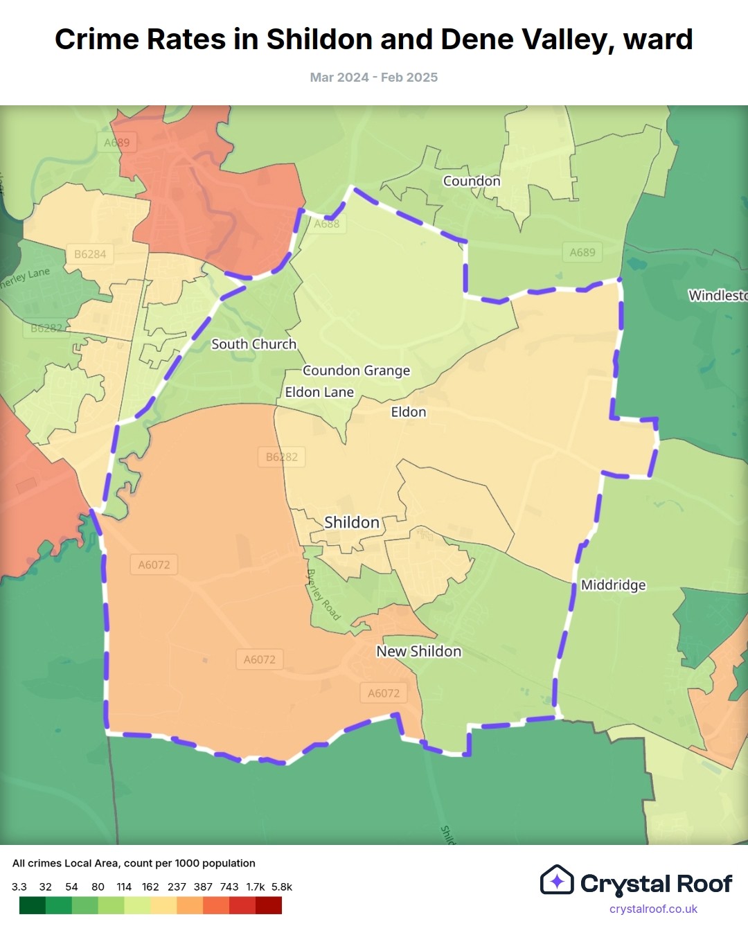 Shildon & Dene Valley, (ward) includes areas with the following crime ratings (see map):