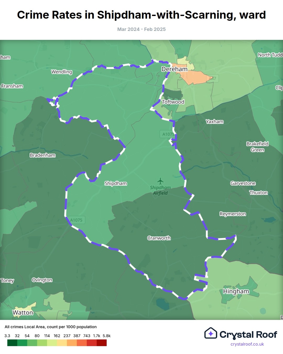 Shipdham-with-Scarning, (ward) includes areas with the following crime ratings (see map):