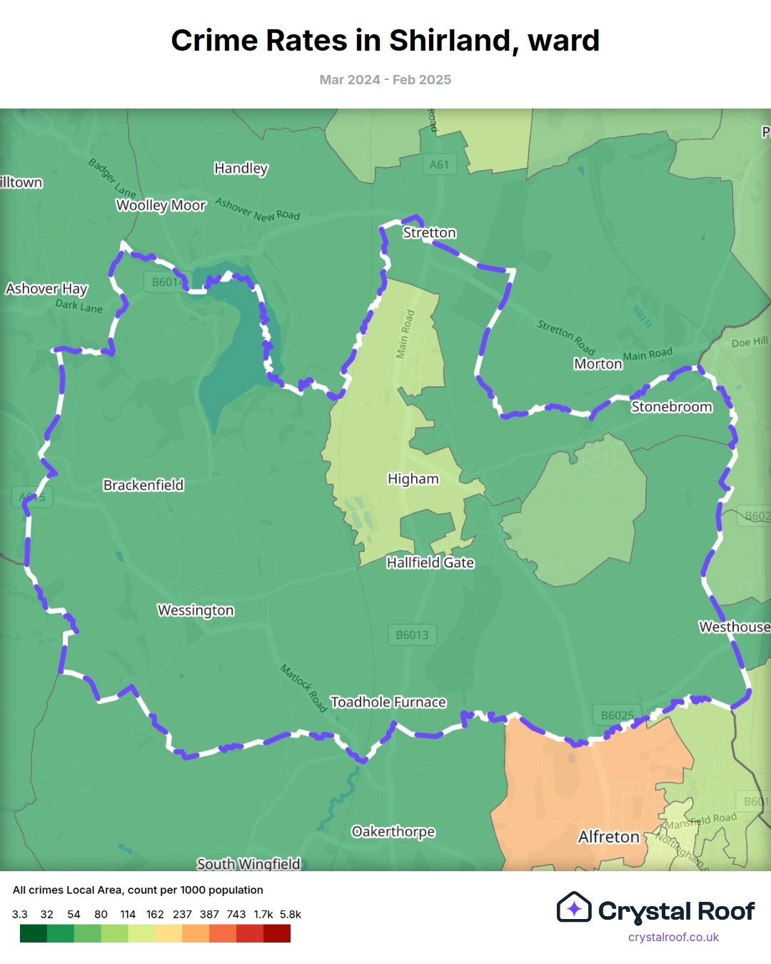 Shirland, (ward) includes areas with the following crime ratings (see map):