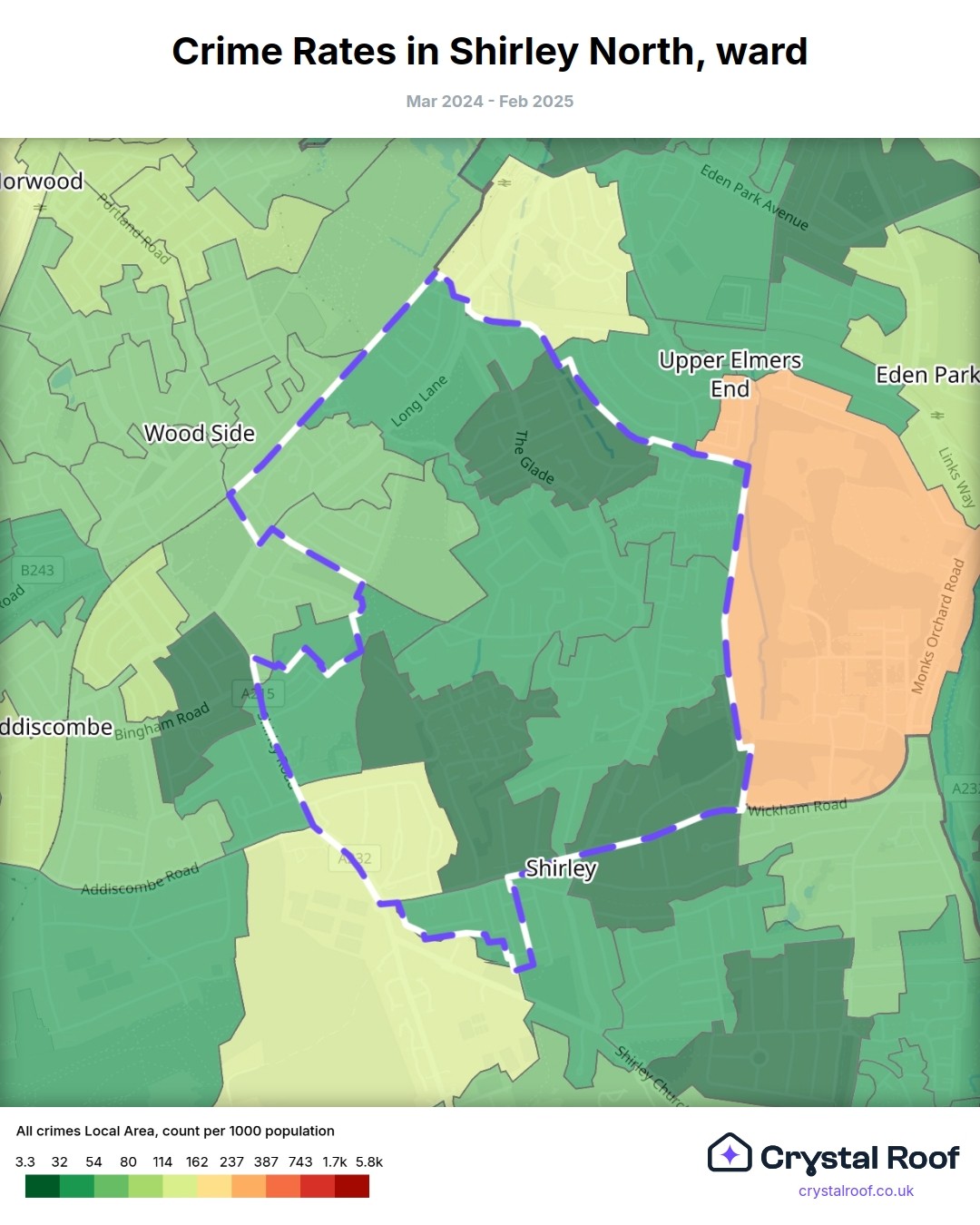 Shirley North (ward) is located within Croydon (borough). Annual total crime rate in Croydon (borough) is 111 crimes per thousand resident population, which can be rated as 5 out of 10 or medium crime level compared to other local authority districts in England and Wales.