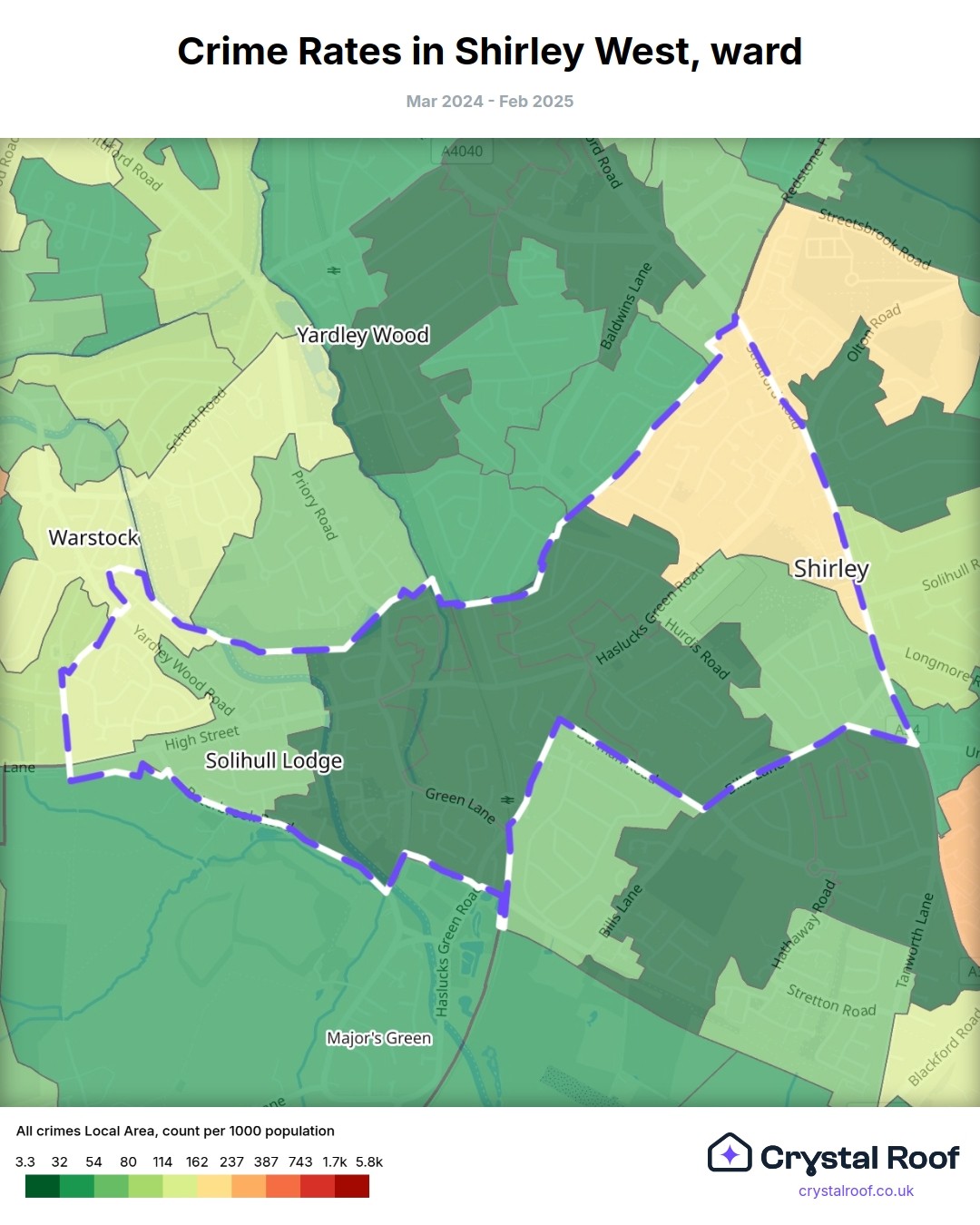 Shirley West (ward) is located within Solihull (borough). Annual total crime rate in Solihull (borough) is 86.6 crimes per thousand resident population, which can be rated as 4 out of 10 or low crime level compared to other local authority districts in England and Wales.