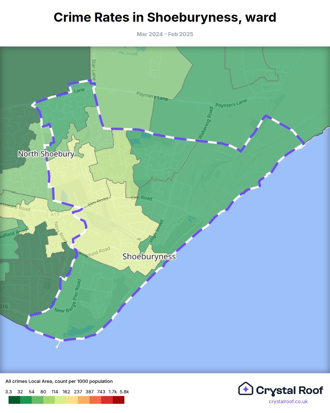 Shoeburyness, (ward) includes areas with the following crime ratings (see map):