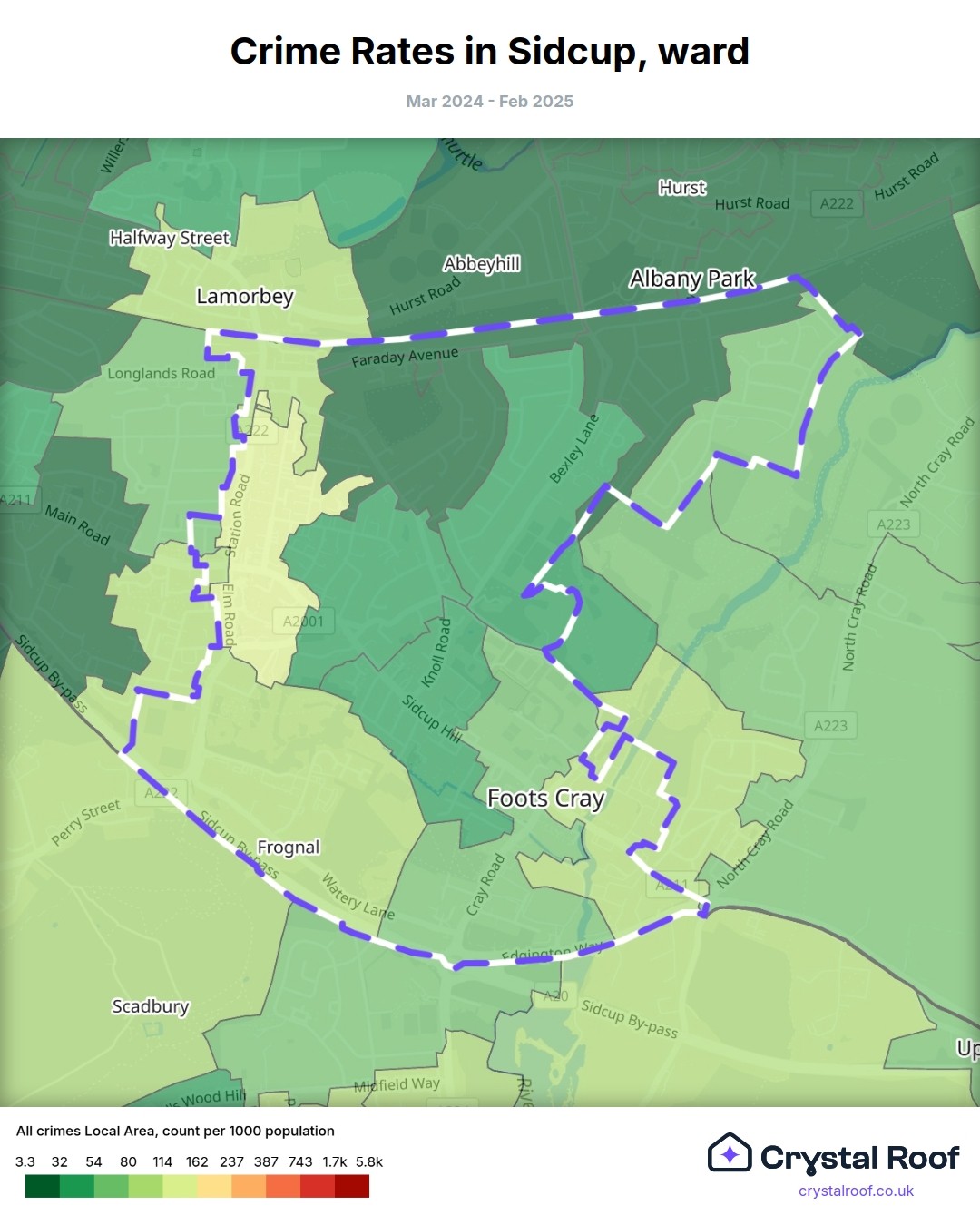 The figures in grey indicate the relative ratings of Sidcup (ward) for a specific crime type compared to other wards in England and Wales.