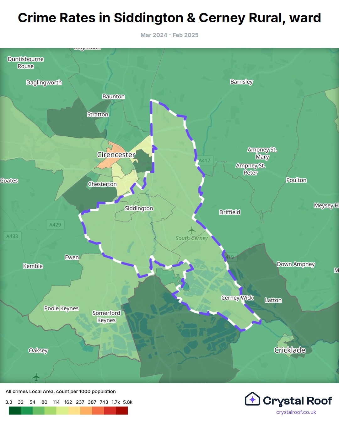 Siddington & Cerney Rural, (ward) includes areas with the following crime ratings (see map):