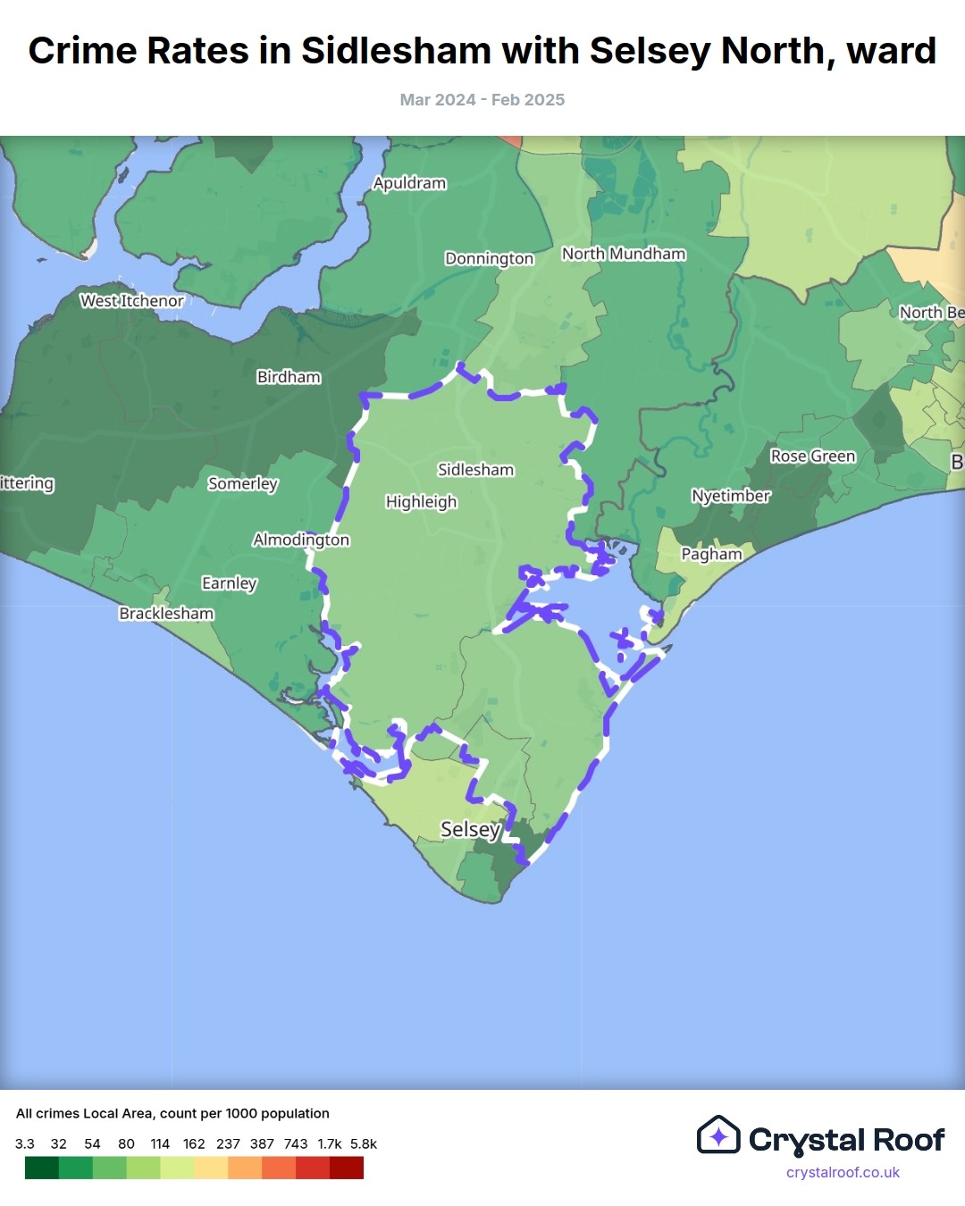 Sidlesham with Selsey North, (ward) includes areas with the following crime ratings (see map):