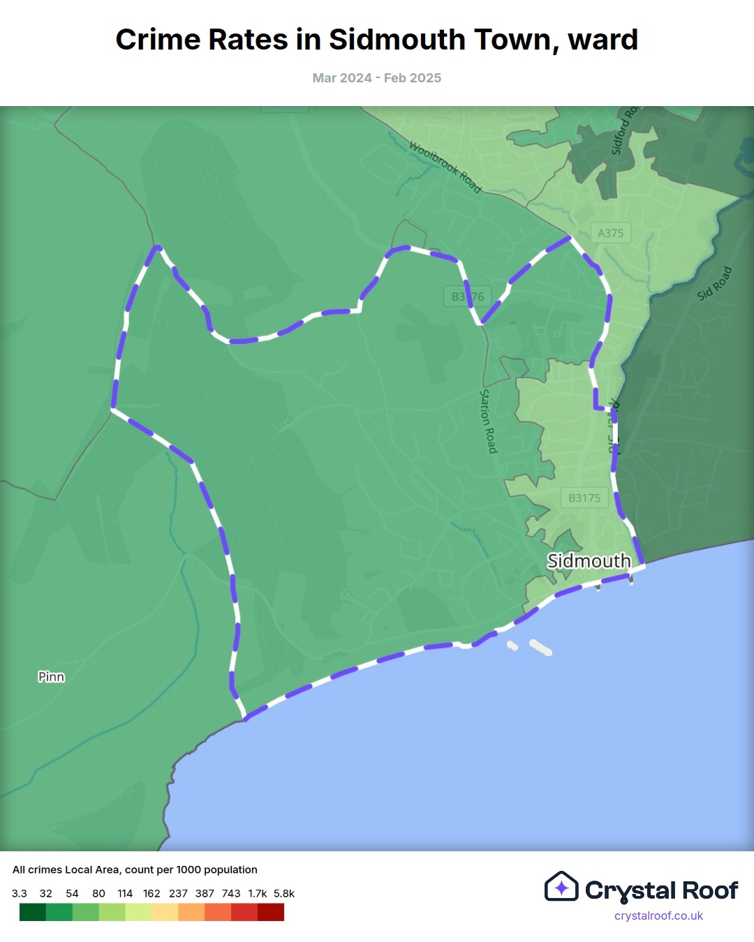 Sidmouth Town, (ward) includes areas with the following crime ratings (see map):