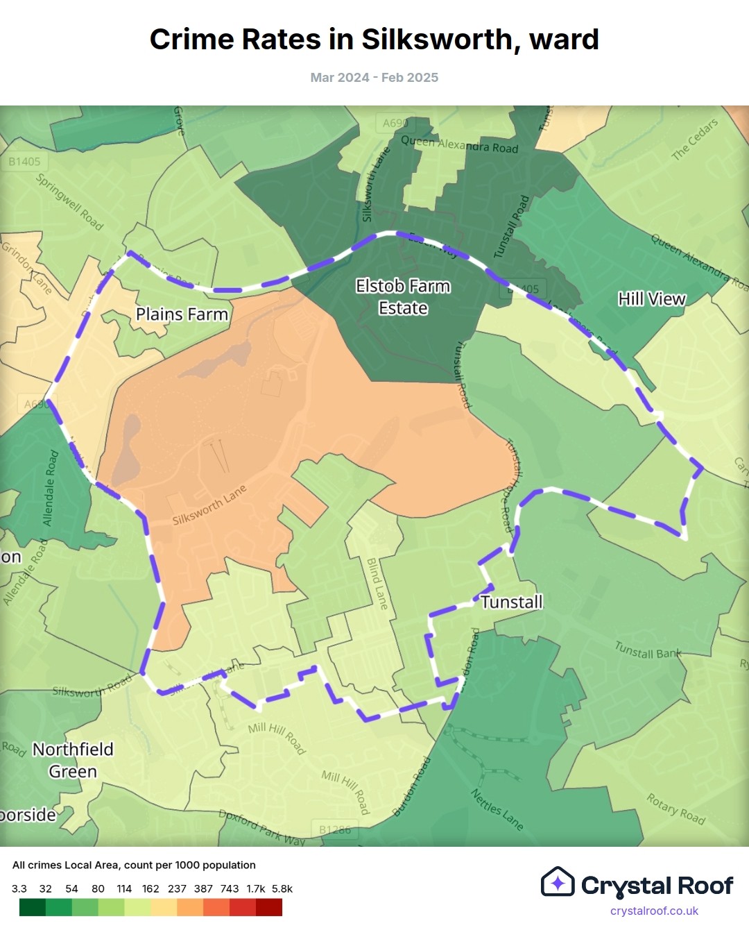 Silksworth, (ward) includes areas with the following crime ratings (see map):