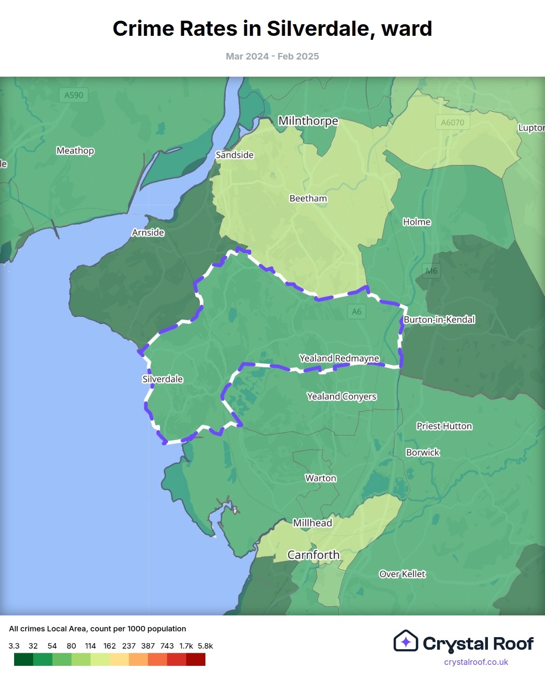 Silverdale (ward) is located within Lancaster (borough). Annual total crime rate in Lancaster (borough) is 109 crimes per thousand resident population, which can be rated as 5 out of 10 or medium crime level compared to other local authority districts in England and Wales.