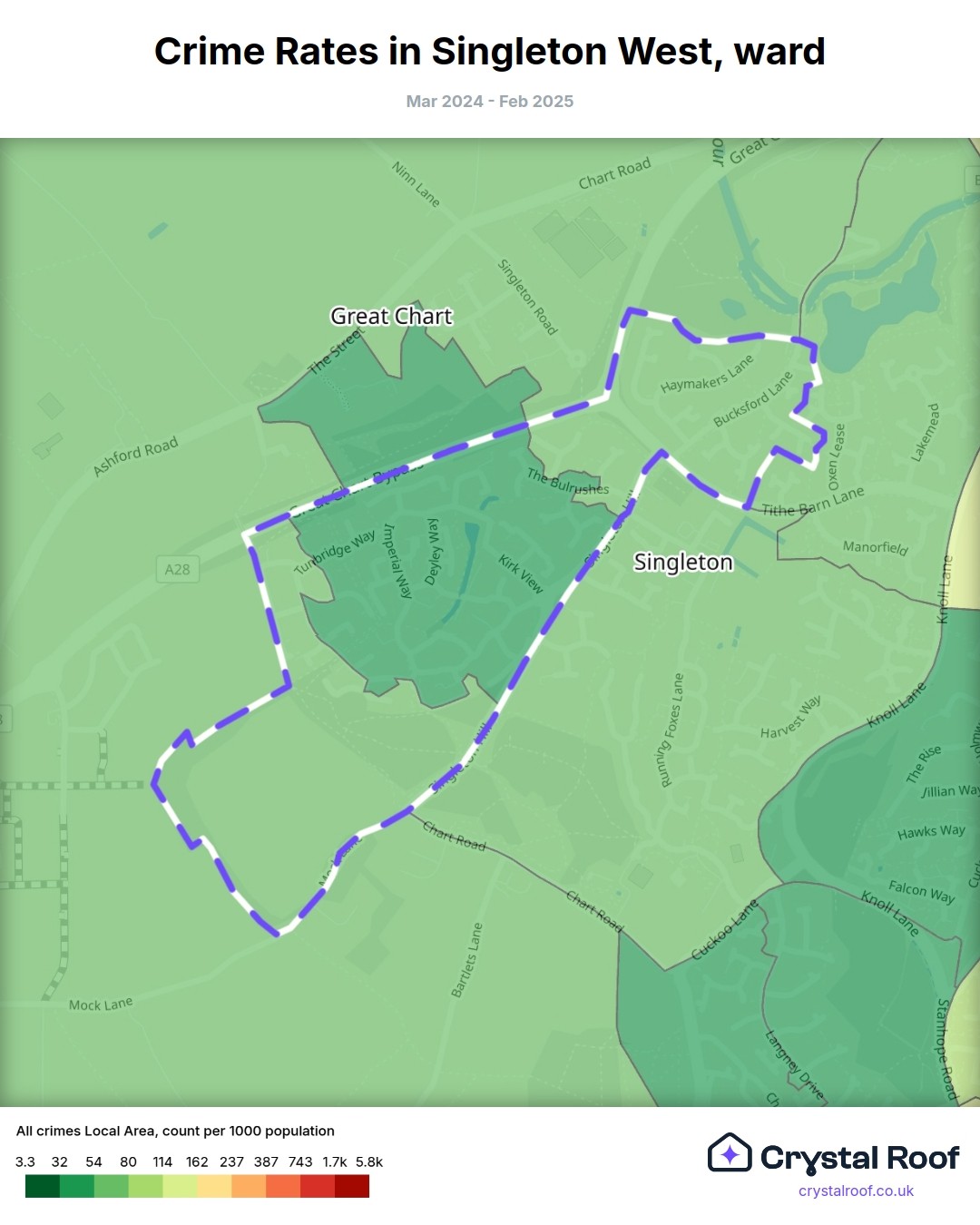 Singleton West (ward) is located within Ashford (borough). Annual total crime rate in Ashford (borough) is 82.8 crimes per thousand resident population, which can be rated as 3 out of 10 or low crime level compared to other local authority districts in England and Wales.