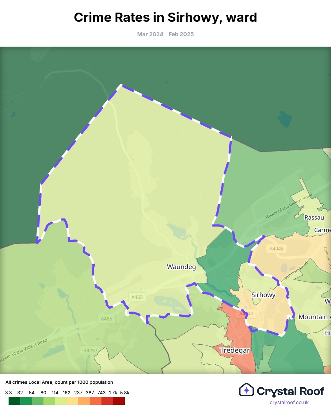 Sirhowy, (ward) includes areas with the following crime ratings (see map):