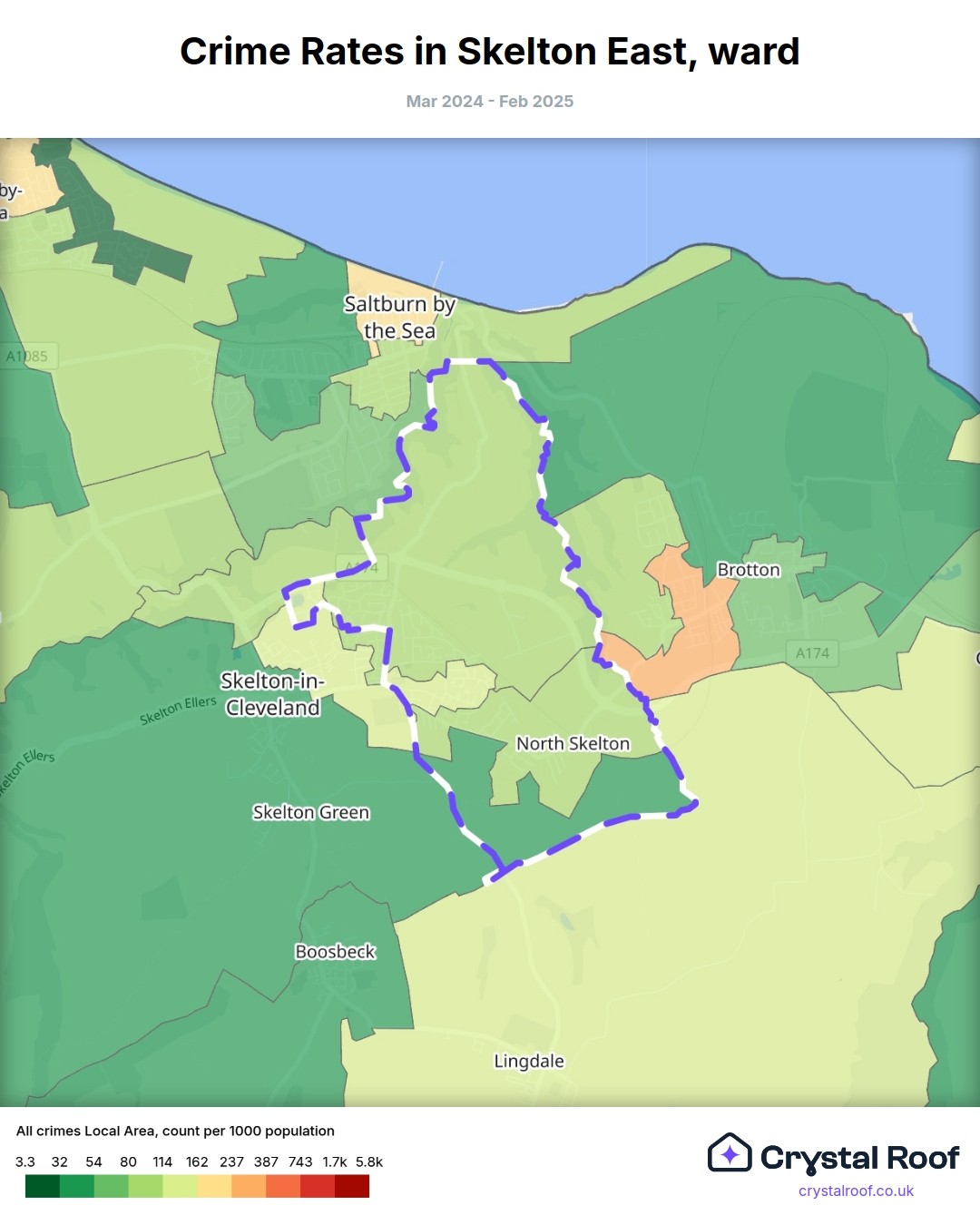 Skelton East, (ward) includes areas with the following crime ratings (see map):