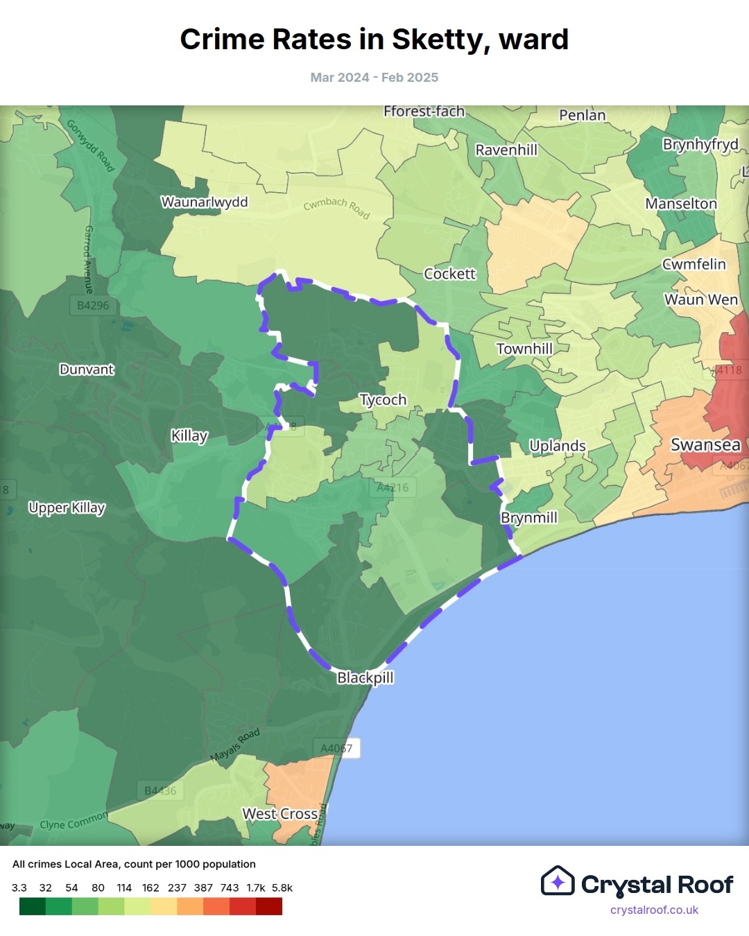 The figures in grey indicate the relative ratings of Sketty (ward) for a specific crime type compared to other wards in England and Wales.
