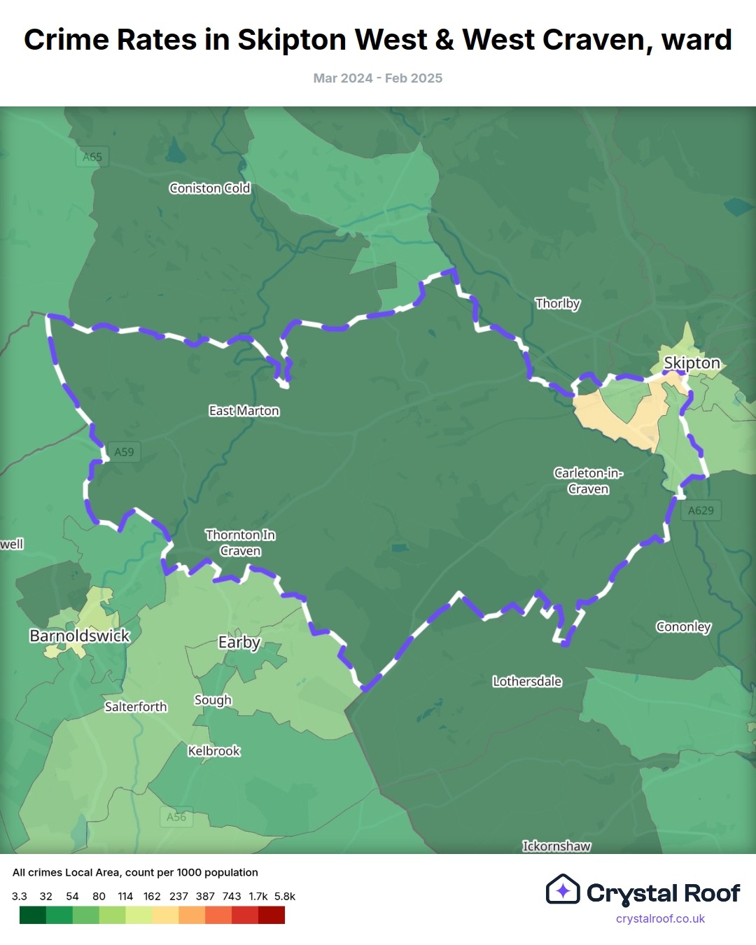 The figures in grey indicate the relative ratings of Skipton West & West Craven (ward) for a specific crime type compared to other wards in England and Wales.